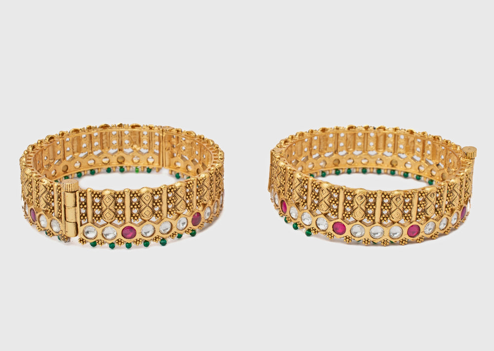 Green and Square-cut Kundan Polki Gold Plated Bangles