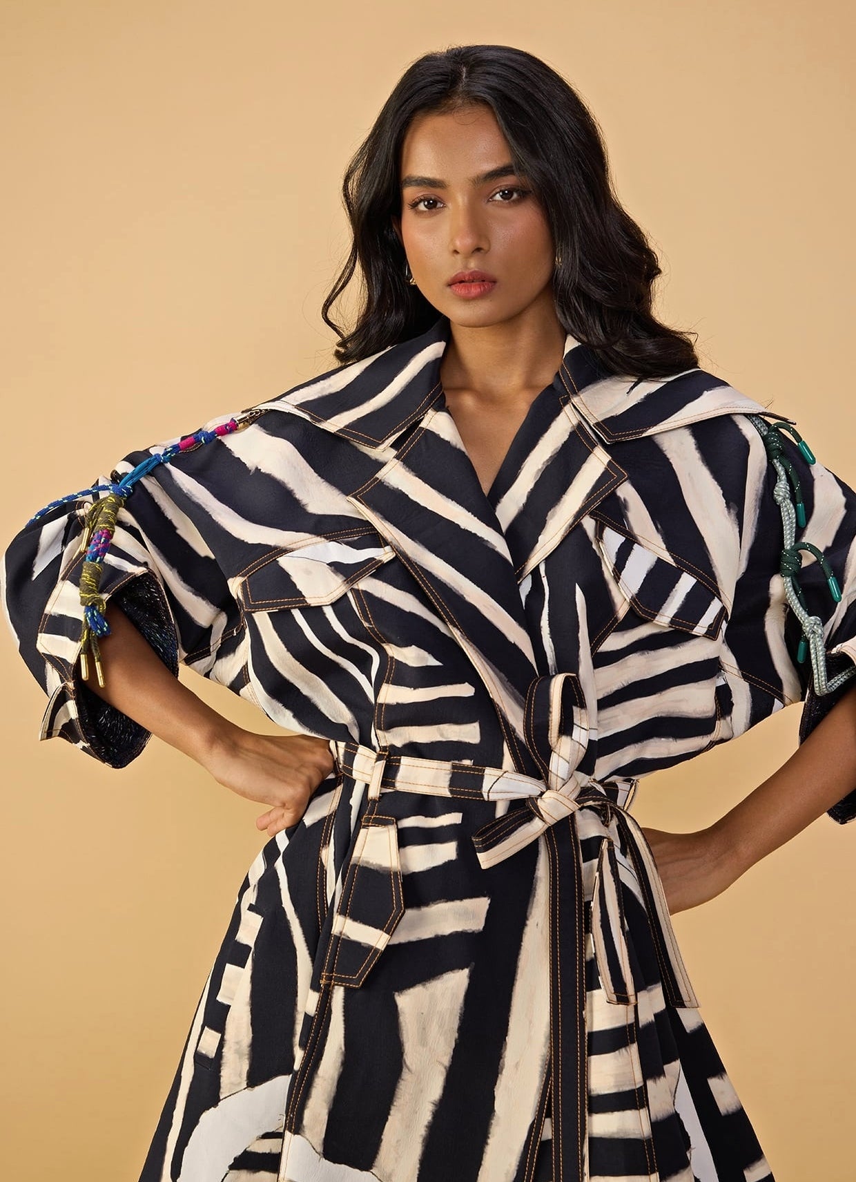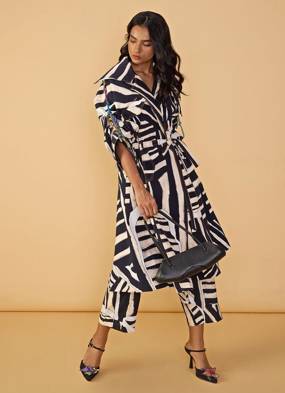 Turn festive evenings into fashion moments with a bold Black and White Printed Trench Coat Set. This outfit includes belted trench coat with an abstract stripe prints and coloured rope shoulder detailing with oversized collar. It is paired with high waist balloon trousers with abstract stripe print and includes pockets for comfort and ease.