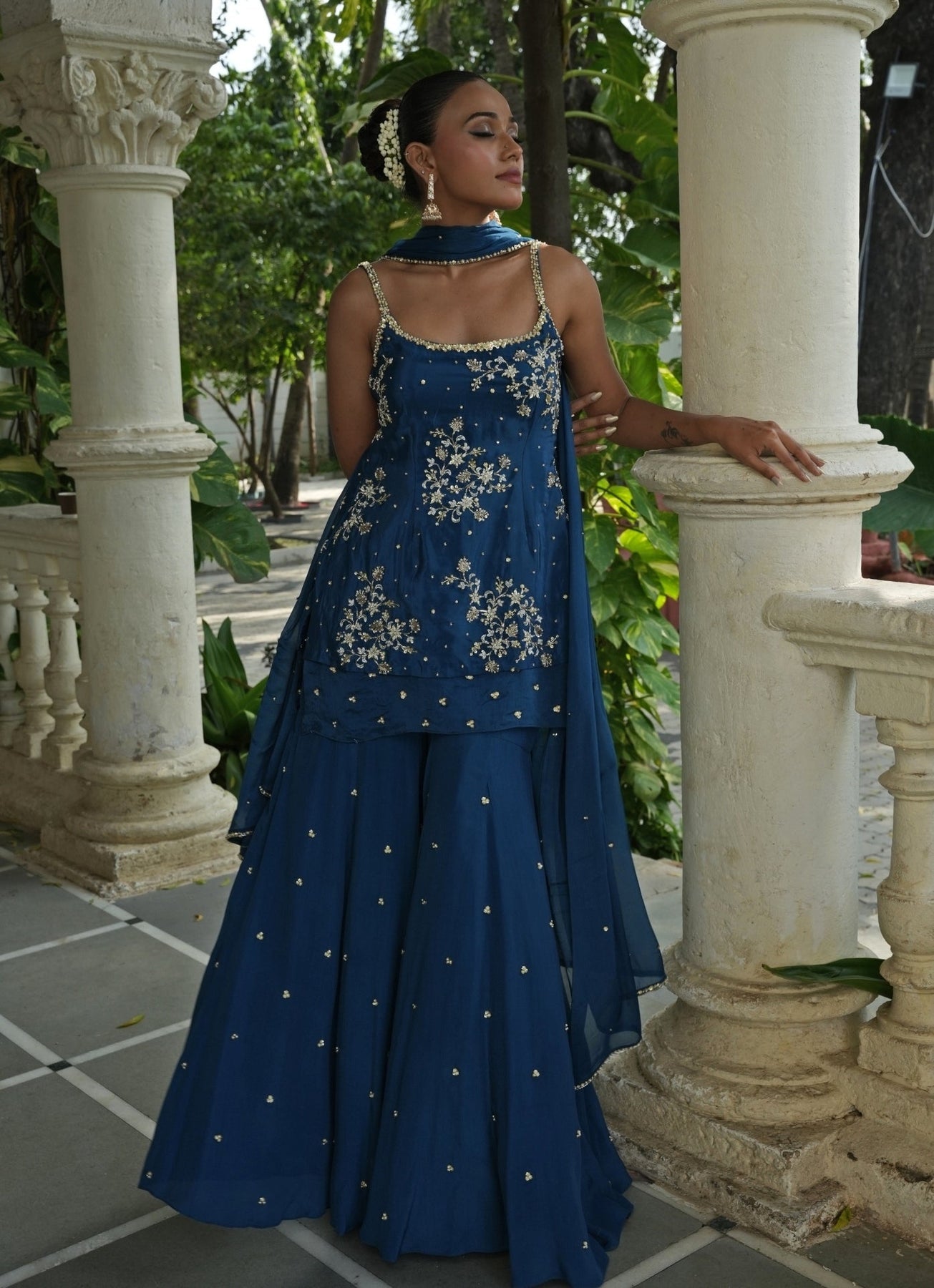 Mark the moment with refined dressing in this Peacock Blue Garara Set designed for vibrant family festivities. The sharara features delicate butti work, creating texture across the flowing silk base. A strap-style kurta is richly embroidered with floral motifs in zardozi, pearls and sequins, adding shimmer and detail, while the embroidered dupatta completes the look with coordinated elegance.