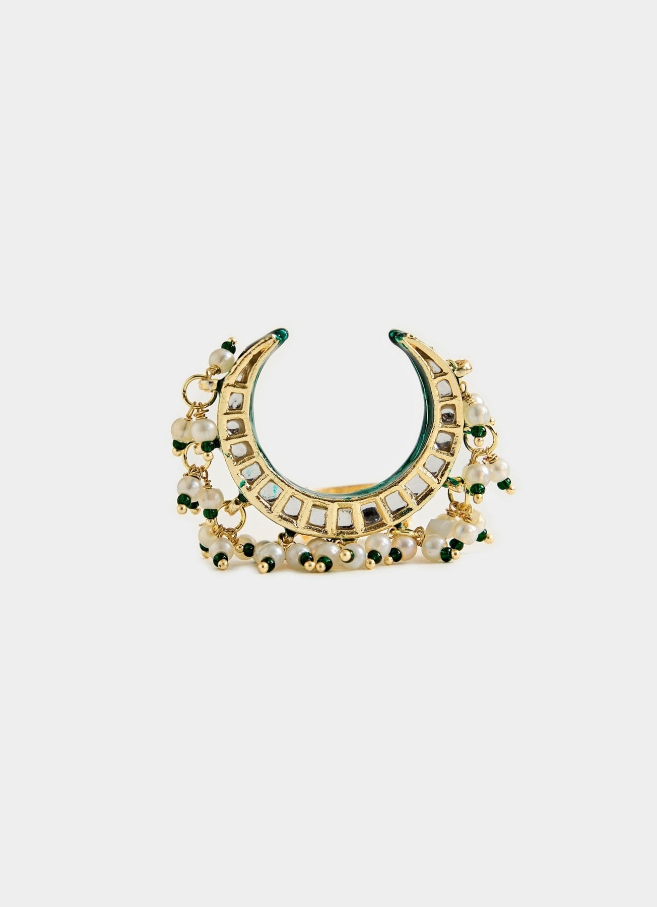 This crescent kundan statement ring blends traditional elegance with sparkling stones and intricate detailing. Designed to add regal charm, it enhances festive and bridal looks with effortless sophistication.
