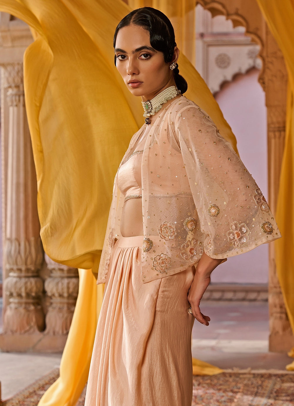 Celebrate in elegance with the Peach Embroidered Satin Skirt Set with Jacket. The satin skirt glows with soft sheen and fluid grace, creating a refined base for the embroidered bustier accented with delicate detailing around the neckline and waist. Completing the look, the short net jacket glistens with intricate hand embroidery, lending a touch of regal charm to every movement.