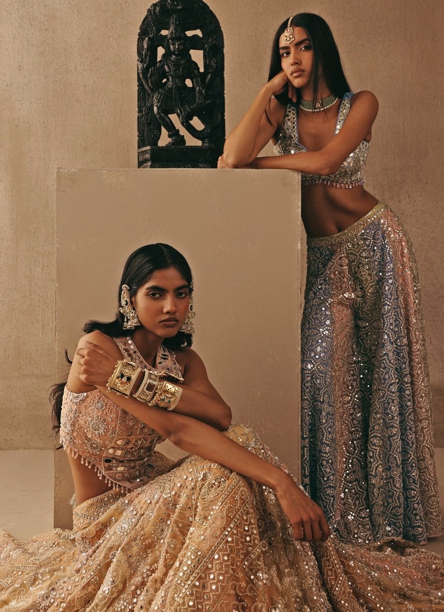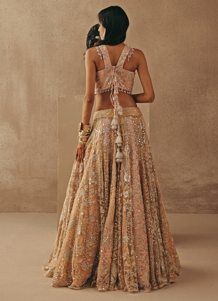 Elevate your pre-wedding festivities in Peach Gold Corset Lehenga Set that feels unapologetically luxe. The fitted conical lehenga features multi-colour mirrorwork that sparkles with every step, creating a high-fashion party mood for your big day moments. Style it with the hand-embroidered peach-gold jaal corset blouse for a defined, structured fit, then add the soft net dupatta with a finished border and long tassels for dramatic movement.