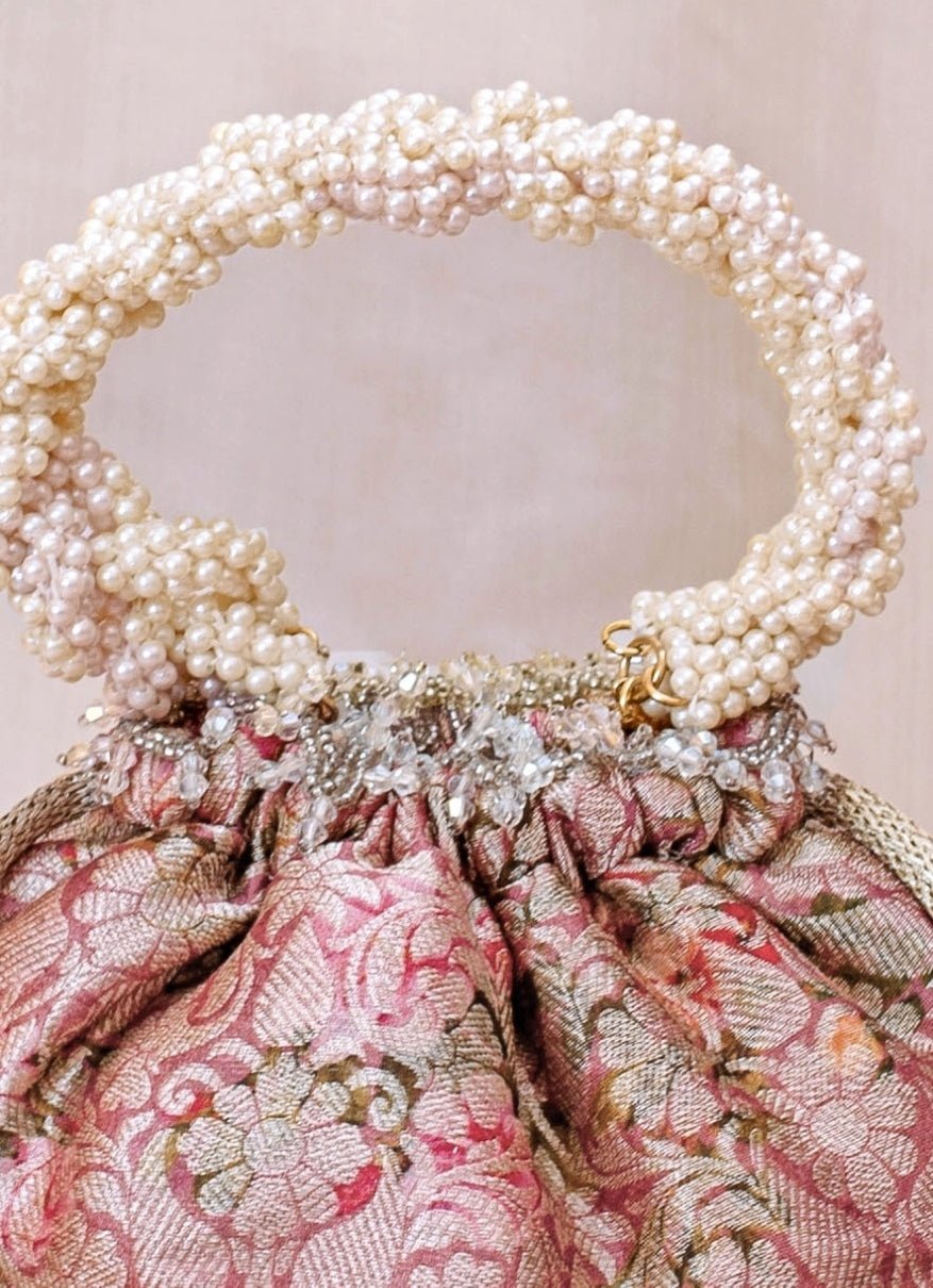 A fusion of contemporary elegance and traditional craft, created using finely chosen brocade and delicate white pearls. Its modern silhouette enhances every festive ensemble. Perfect Pink bucket bag for your Predraped Saree.