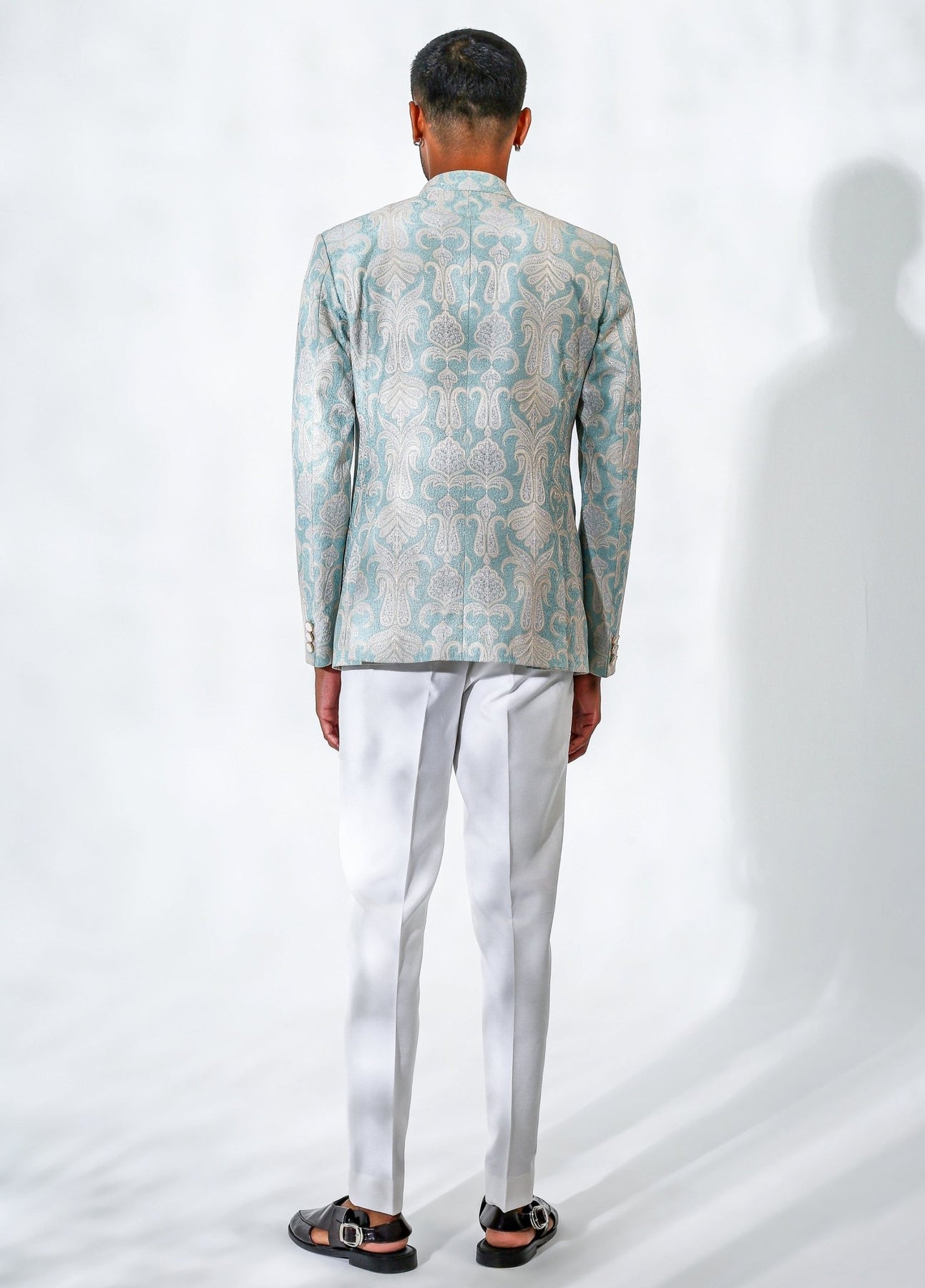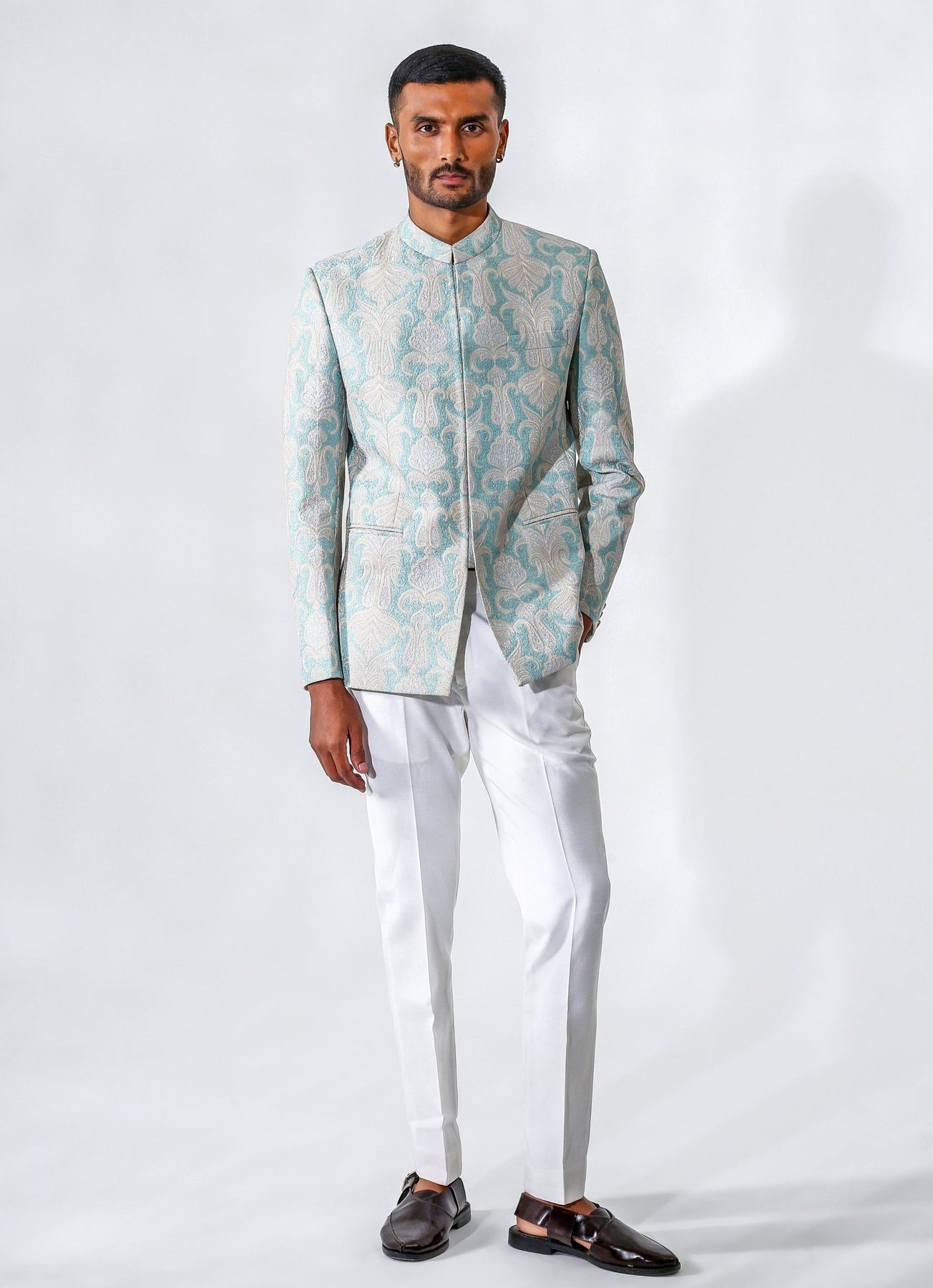 Command attention with a look that blends refined charm and contemporary poise in this Powder Blue Bandhgala Set. Crafted in rich cotton-silk fabric, the ivory fusing pants offer a smooth, comfortable base that complements the richness of the outfit. The Chanderi silk embroidered bandhgala elevates the design with intricate detailing and a luminous finish perfect for festive evenings.