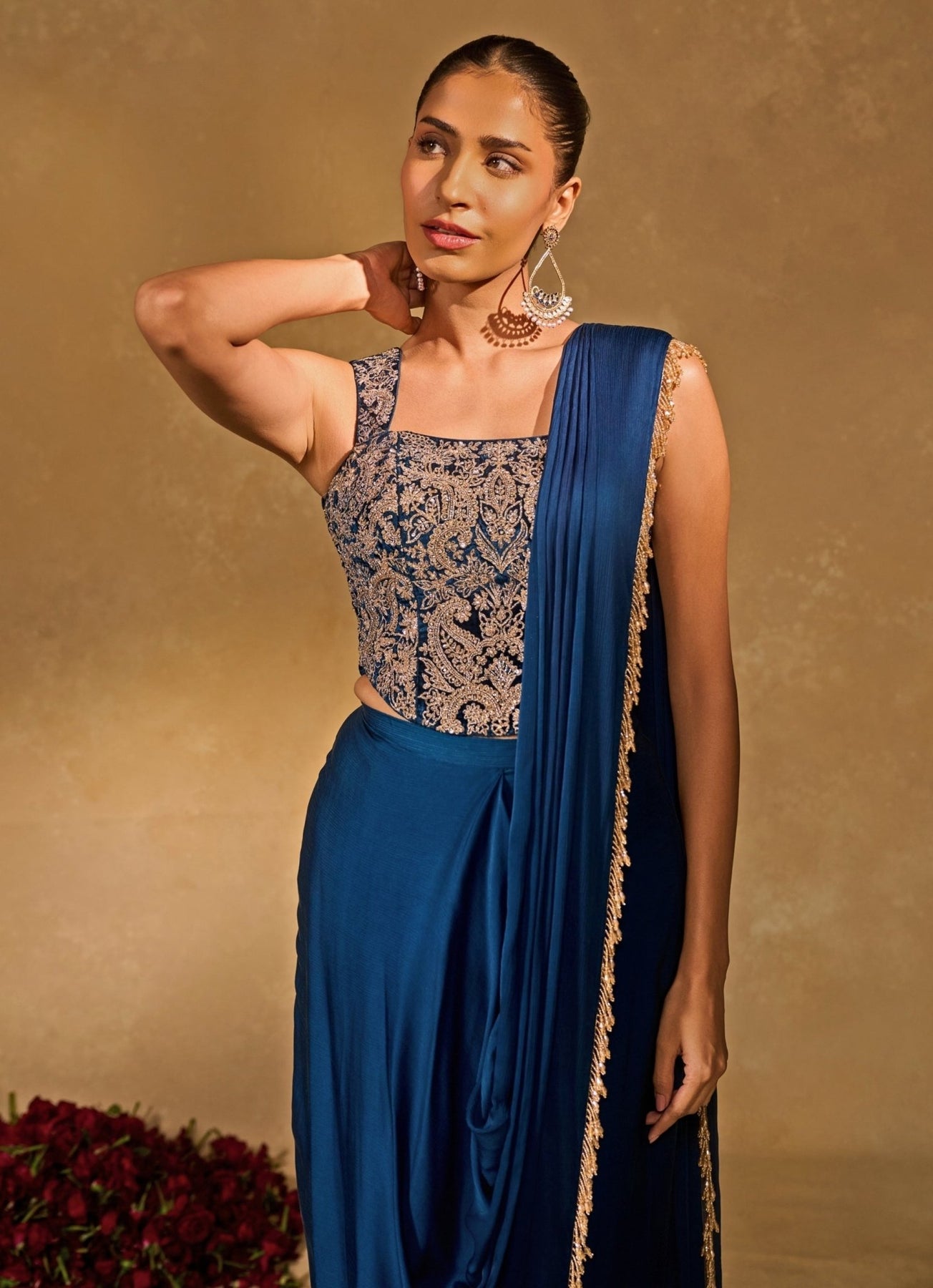 Celebrate in elegance with striking Blue Skirt Saree with Corset. The dhoti-style satin chiffon skirt saree is highlighted with tassel edging that adds playful movement, paired with a velvet corset blouse intricately encrusted with sequins, zari and glass beads. C