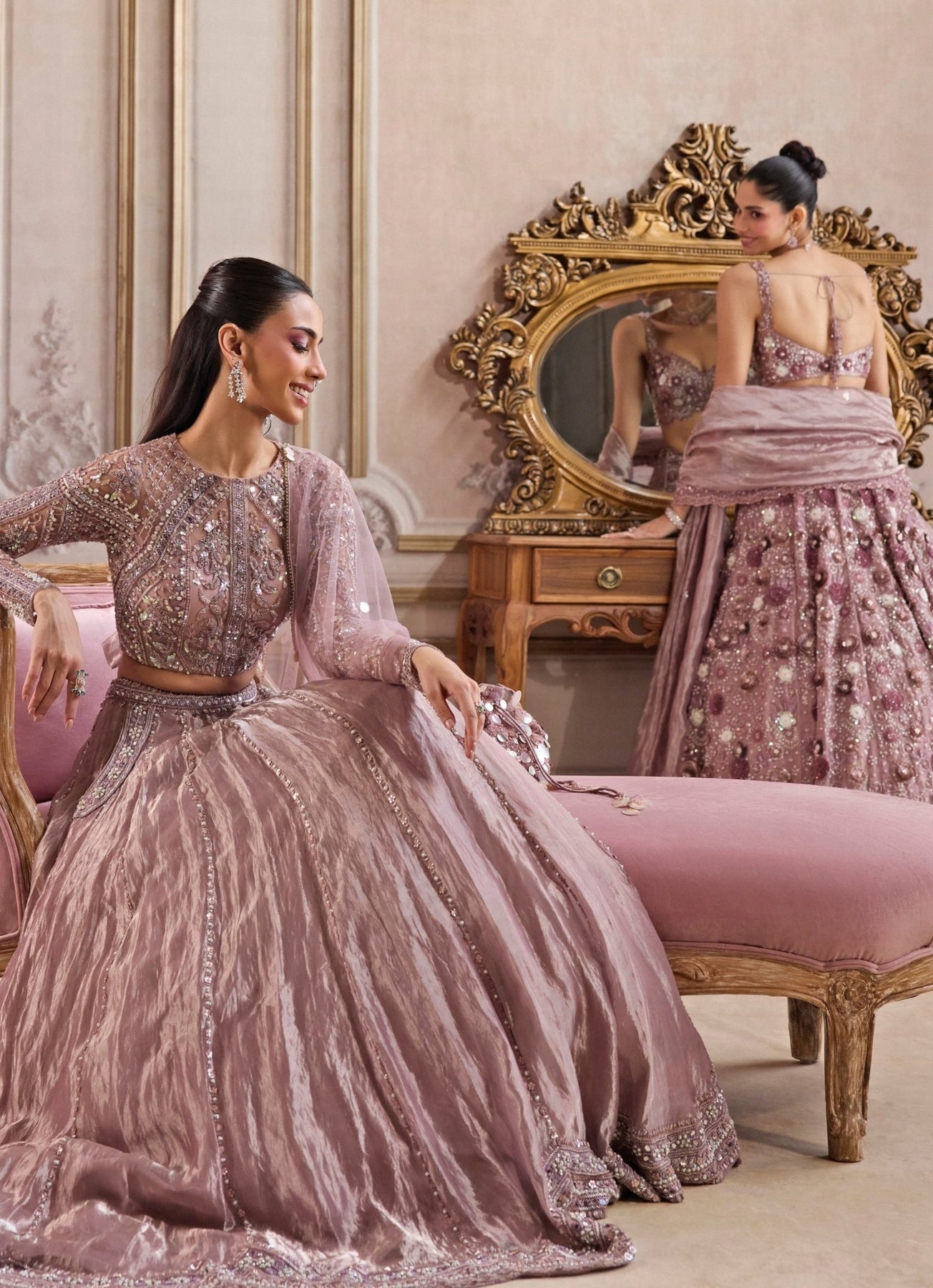 Celebrate your special day in the Champagne Lilac Lehenga Set. The pure silk tissue lehenga glimmers with refined artistry, featuring a scalloped border embroidered with floral and geometric patterns in cutdana, sequins, beads, and mirrors. Its full-sleeved blouse blends traditional craftsmanship with contemporary charm through exquisite hand embroidery, while subtle pockets add a touch of practicality. A sheer net dupatta with statement tassels completes this radiant look.