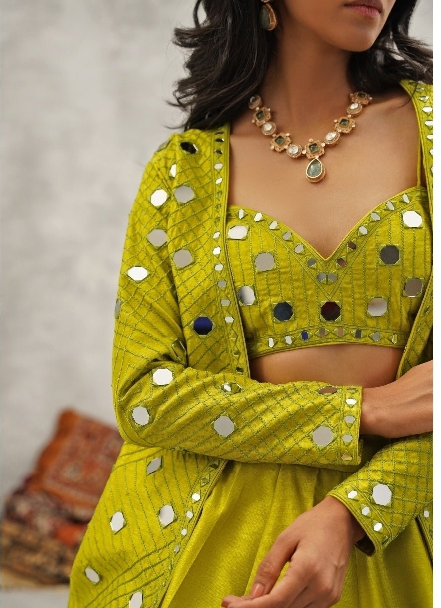 Lime Green Silk Jacket Lehenga Set Kapda Dori - Fabilicious Fashion