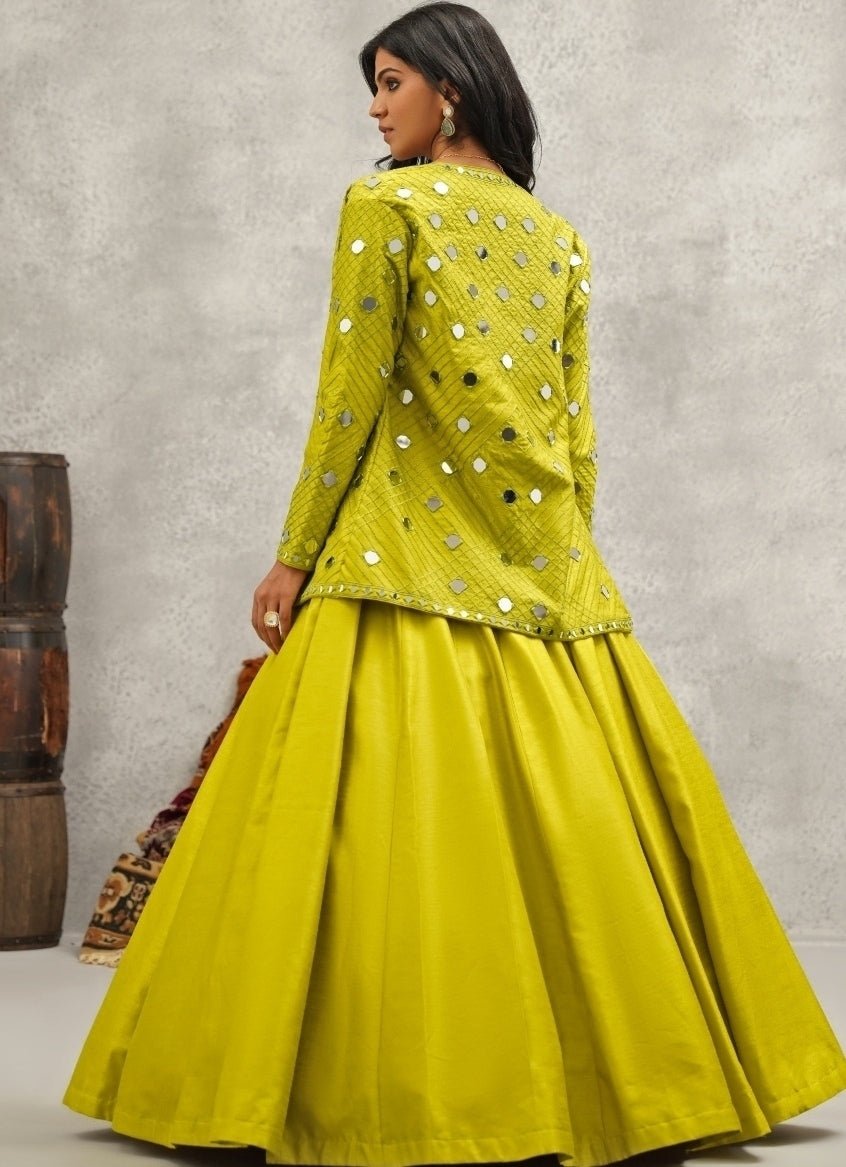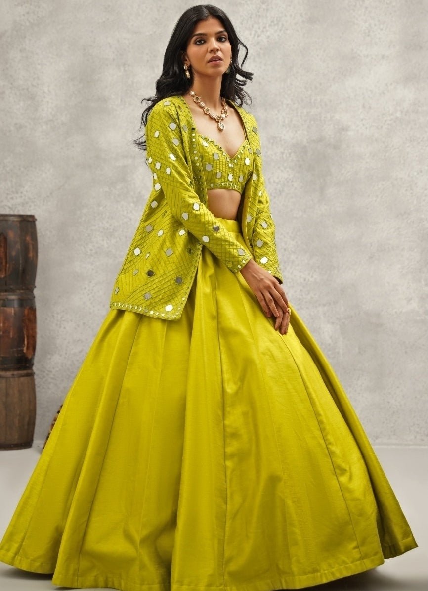 Curate colour-perfect harmony with a fresh Lime Green Jacket Lehenga Set, made for joyful moments. The dupion silk lehenga feels light yet luxurious, bringing ease and polish to daytime celebrations. It is styled with a matching silk blouse highlighted with mirror and resham embroidery, adding festive sparkle. A coordinating dupion silk jacket with detailed embroidery elevates the look with modern elegance. Perfect Lehenga for Bridesmaid for Mehendi and Haldi Ceremony.