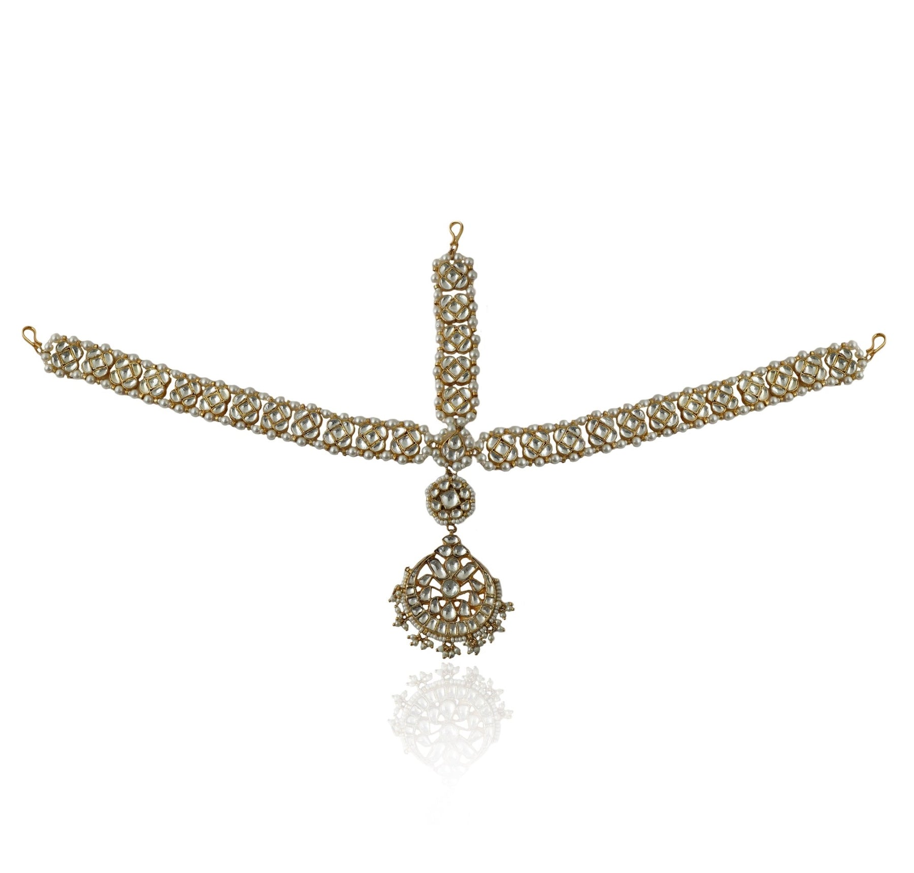 Radiating bridal grace and traditional artistry, this Mathapatti is an exquisite fusion of timeless craftsmanship and modern opulence. The maathapatti features intricately set white jadtar stones framed in gold plating, accented by delicate pearl strings that add softness and luminosity. The central pendant cascades elegantly on the forehead, enhancing every bride’s charm with regal allure. A perefct statement for a bridal lehenga.