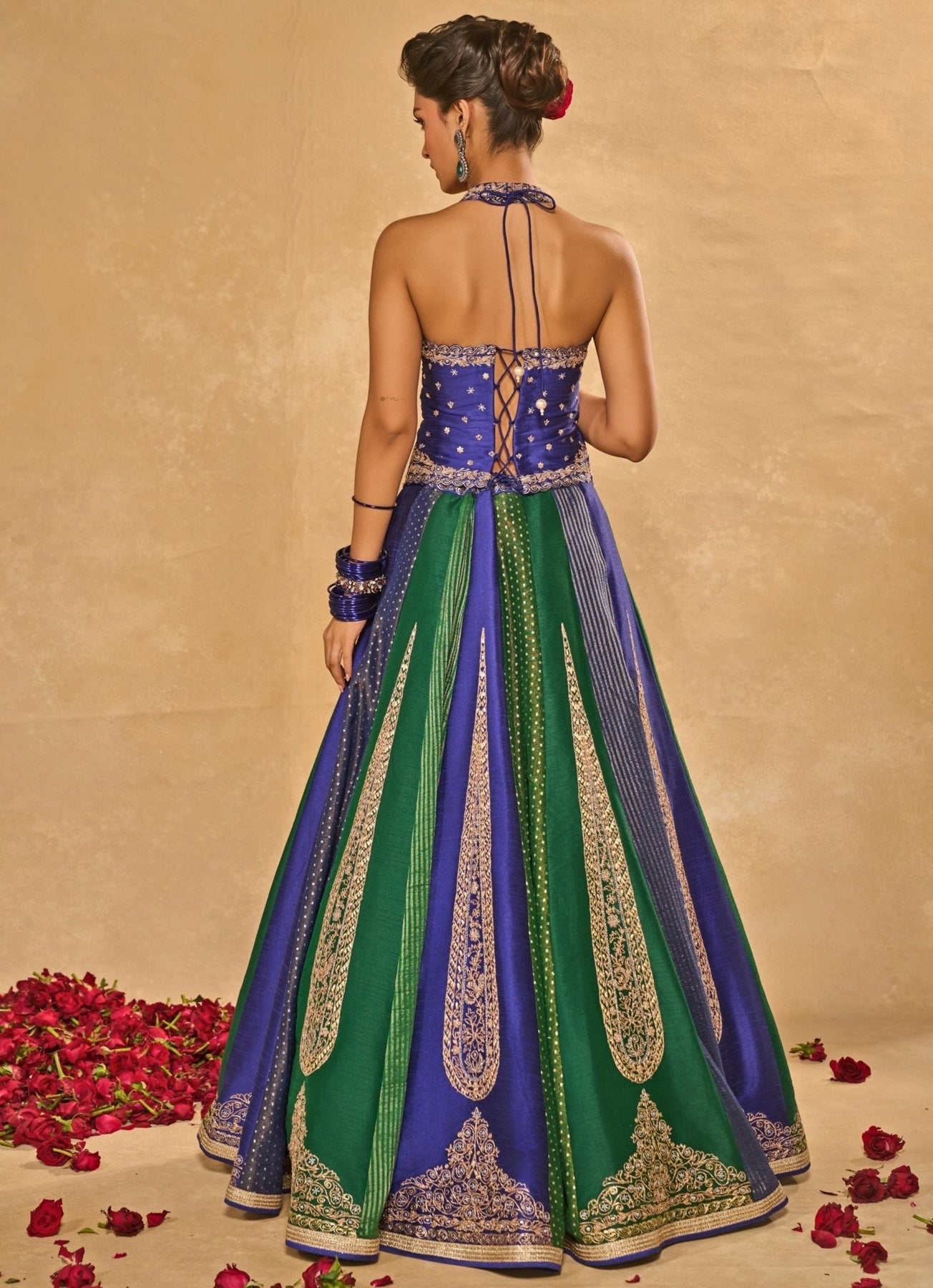 Bring a touch of couture to your bridal journey in radiant Green and Blue Corset Lehenga Set. The 10-kali dupion silk and tissue jamewar lehenga is intricately woven and delicately encrusted with zari embroidery, creating rich festive dimension with graceful movement. It is paired with a blue halter-neck corset blouse embellished in zari, sequins and glass beads, and completed with a sheer blue organza dupatta edged in green appliqué embroidery.