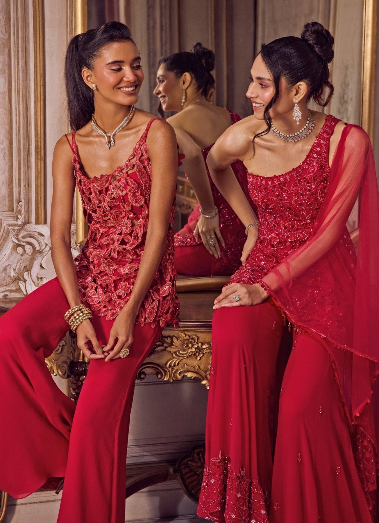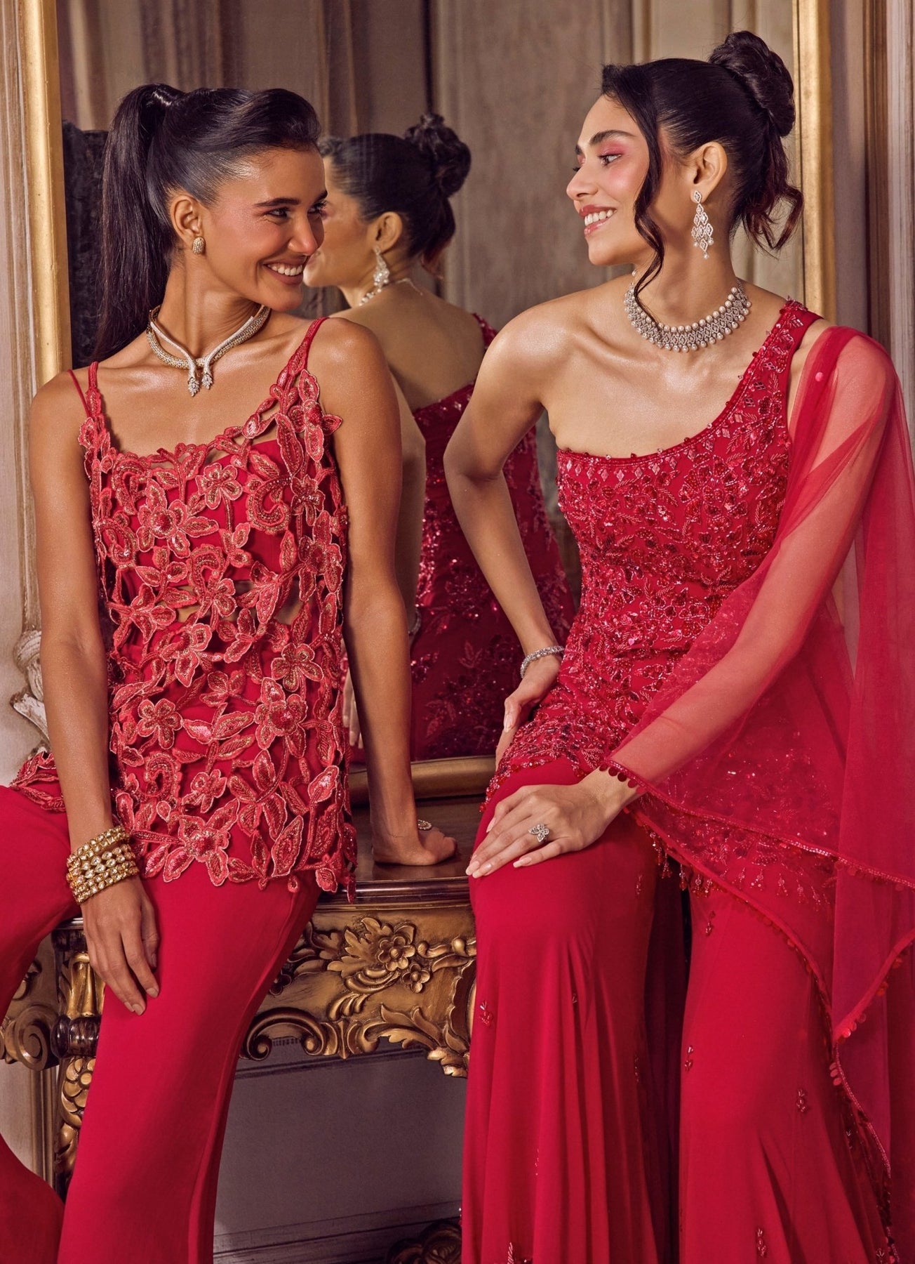 Capture effortless chic for every occasion in the Hot Pink Kurta Pants Set. The sheer floral cutwork kurta makes a statement with its exquisite embroidery, highlighted with zari, dori, cutdana, and sequins that shimmer softly with every move. Styled over a sleek bustier and paired with flowing kalidar pants in georgette, this look blends modern artistry with timeless grace—ideal for elegant celebrations.