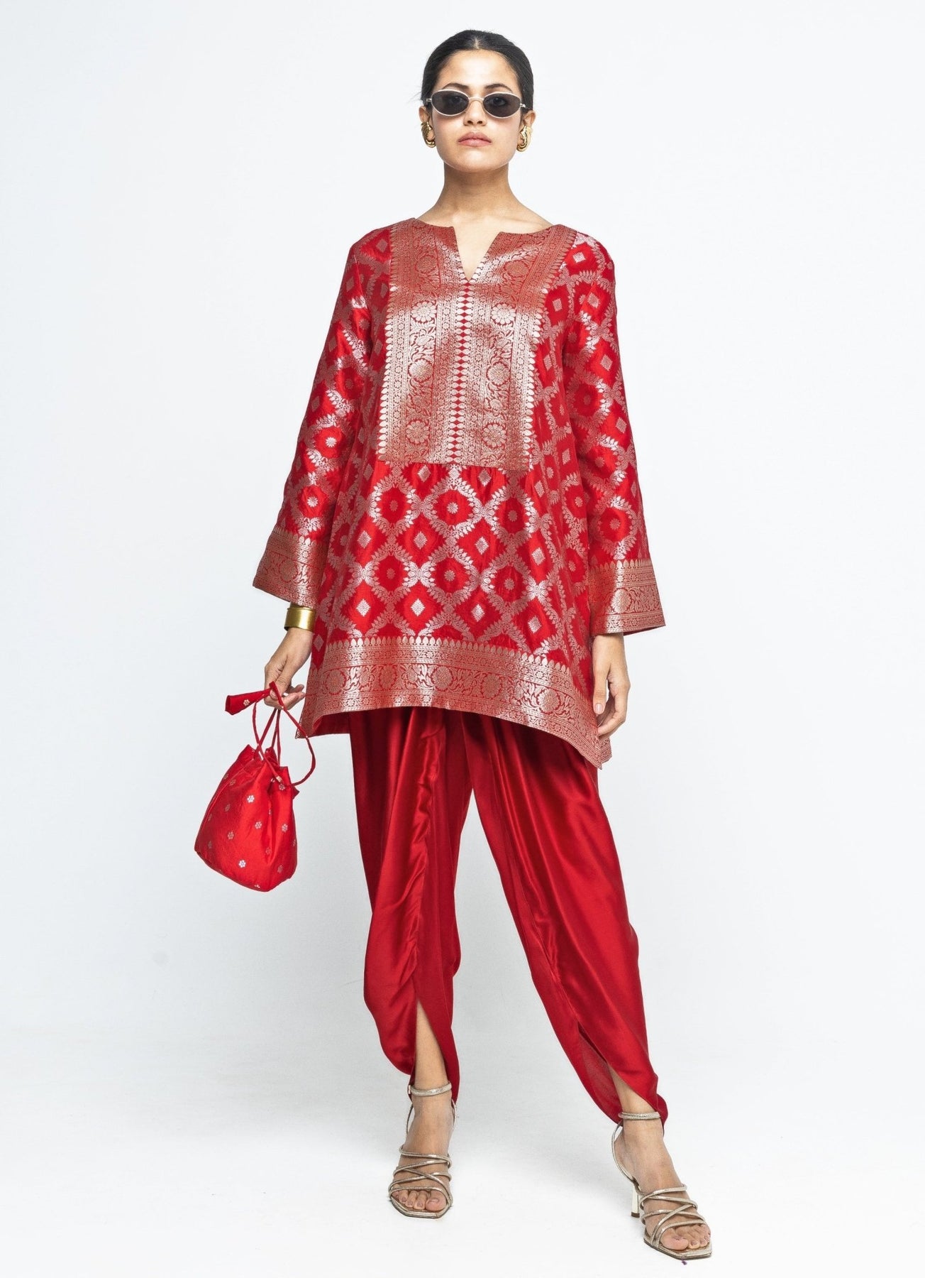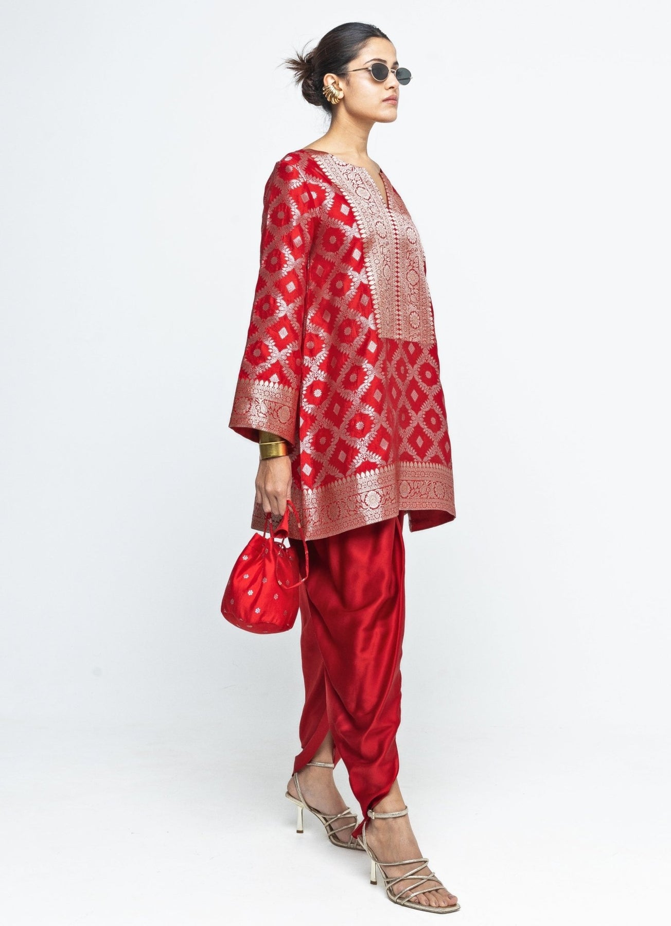 Red Jaal Silk Kurta Dhoti Set Sobariko - Fabilicious Fashion