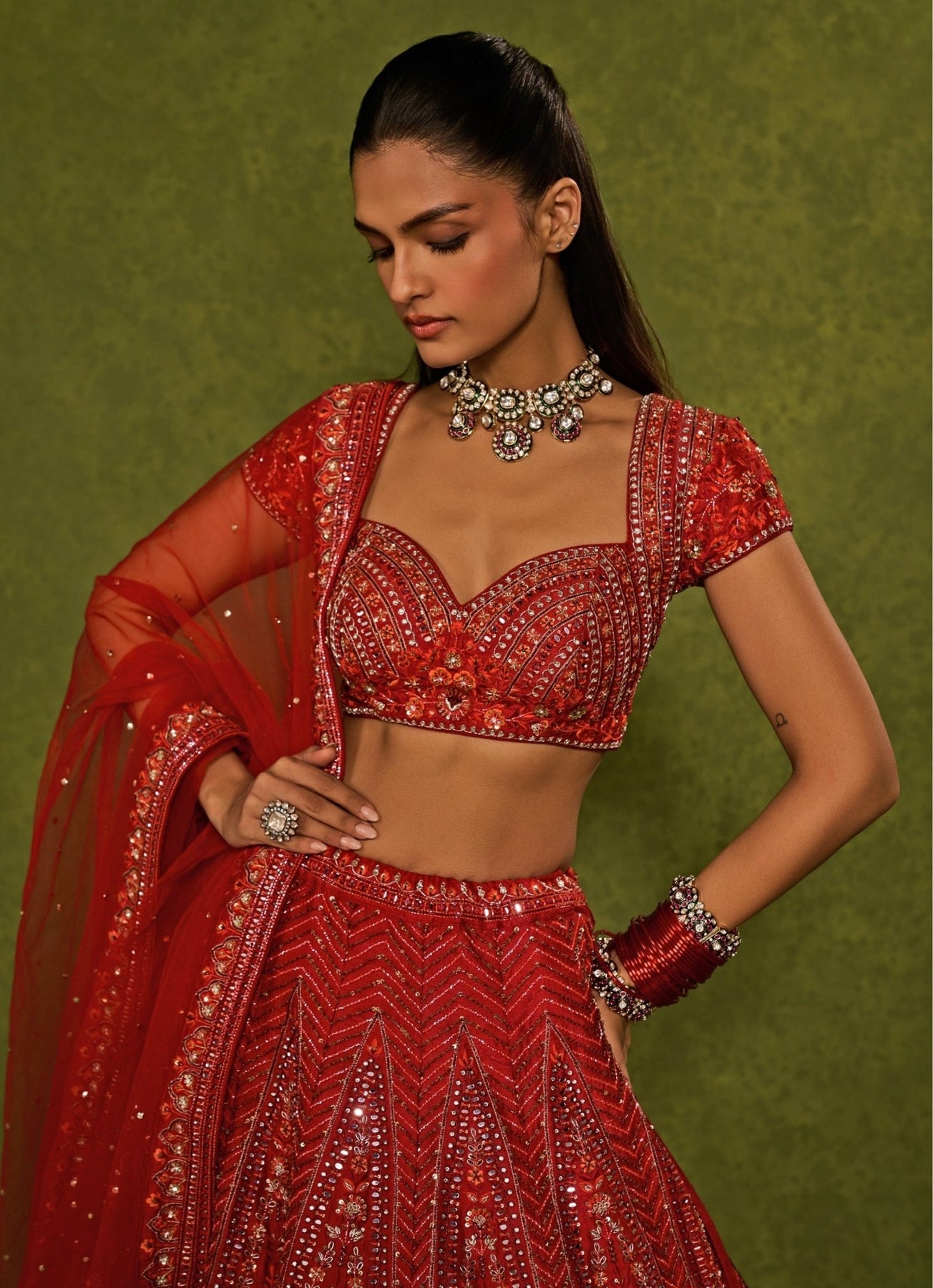 Embrace your journey to “I do” wearing classic Red Bridal Lehenga Set. The raw silk lehenga blooms with floral embroidery crafted in thread, sequins, zardozi and glass beads, creating depth and celebratory richness. A sweetheart-neck cap sleeve blouse richly embroidered to perfection pairs seamlessly with a matching soft net dupatta finished with embellished borders and badla accents. Perfect Lehenga for Bride to be for Big Day, Cocktail & Reception.