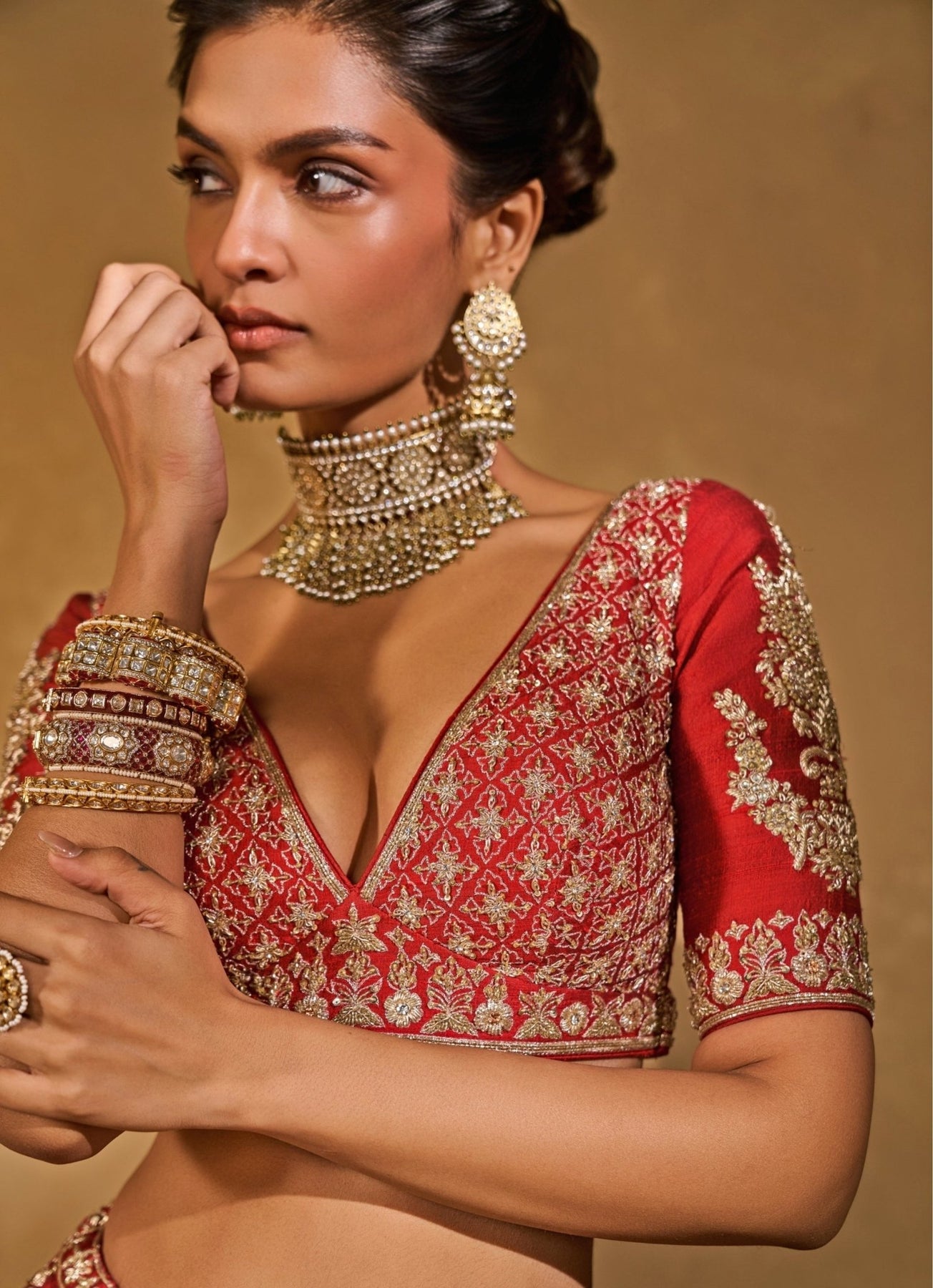 Red Raw Silk Lehenga With Banarasi Dupatta Chamee & Palak - Fabilicious Fashion