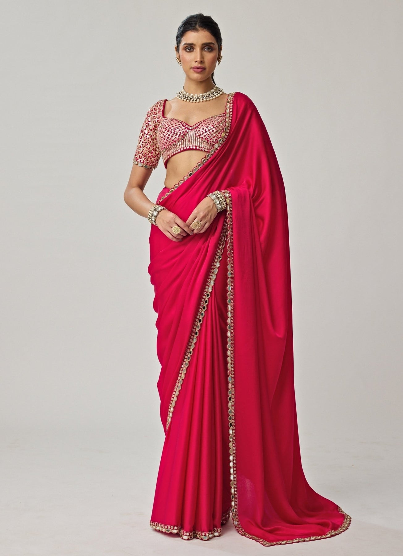 Bring family-focused glamour to every celebration with this Crimson Red Satin Saree. The fluid satin fabric drapes with rich luminosity, while the georgette blouse is delicately hand-embroidered with gota and mirror detailing on elegant half sleeves.