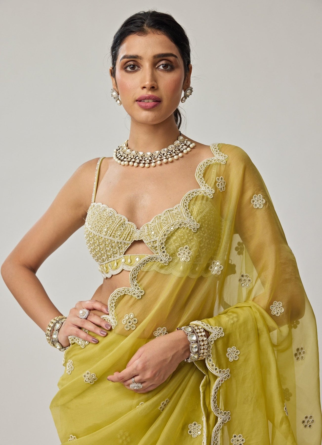 Shine as the ultimate wedding guest in this Lime Green Organza Saree that evokes lush celebration. The airy organza saree glows with natural sheen, and the heavily embroidered blouse enhances its luminous charm.