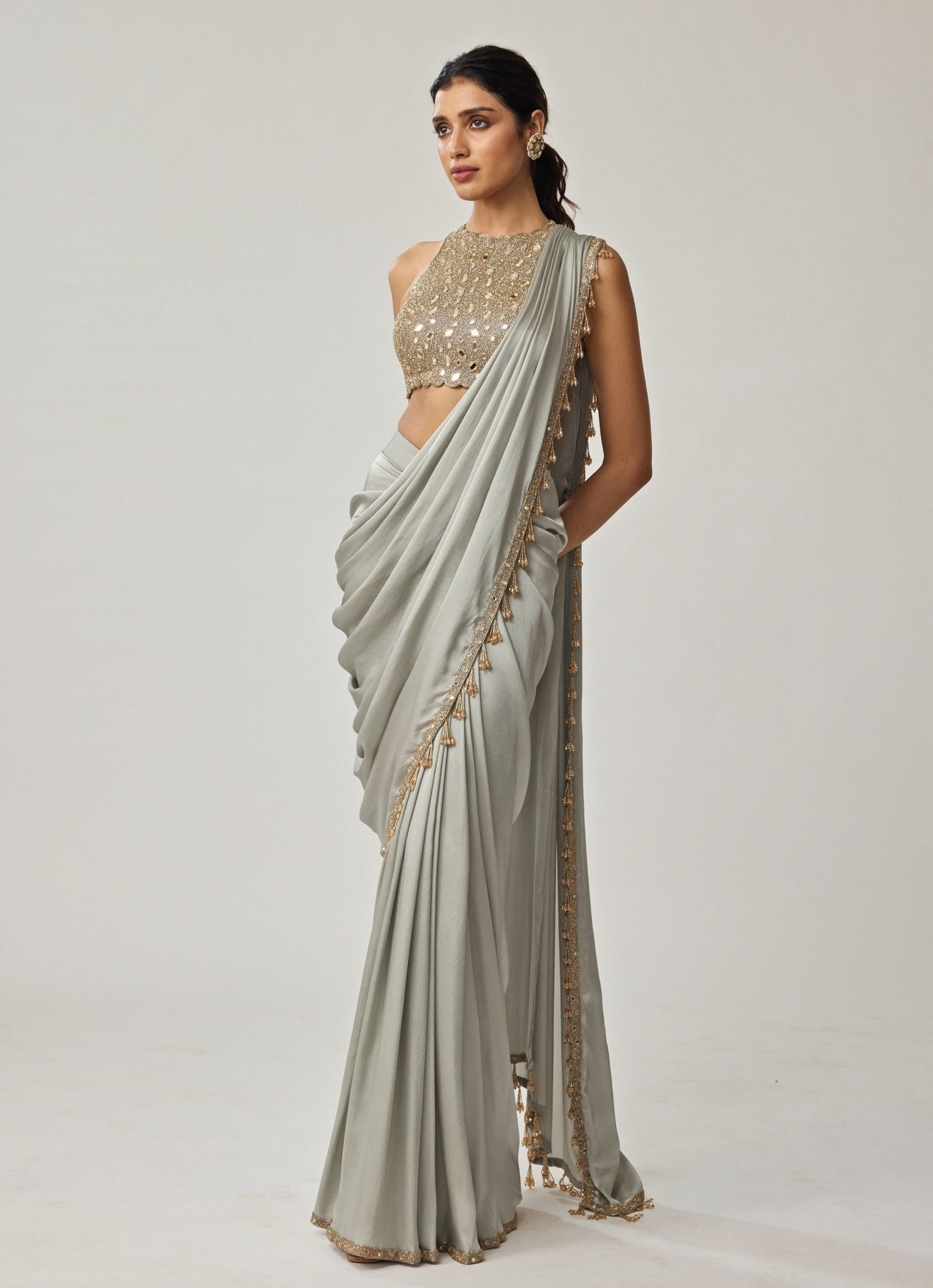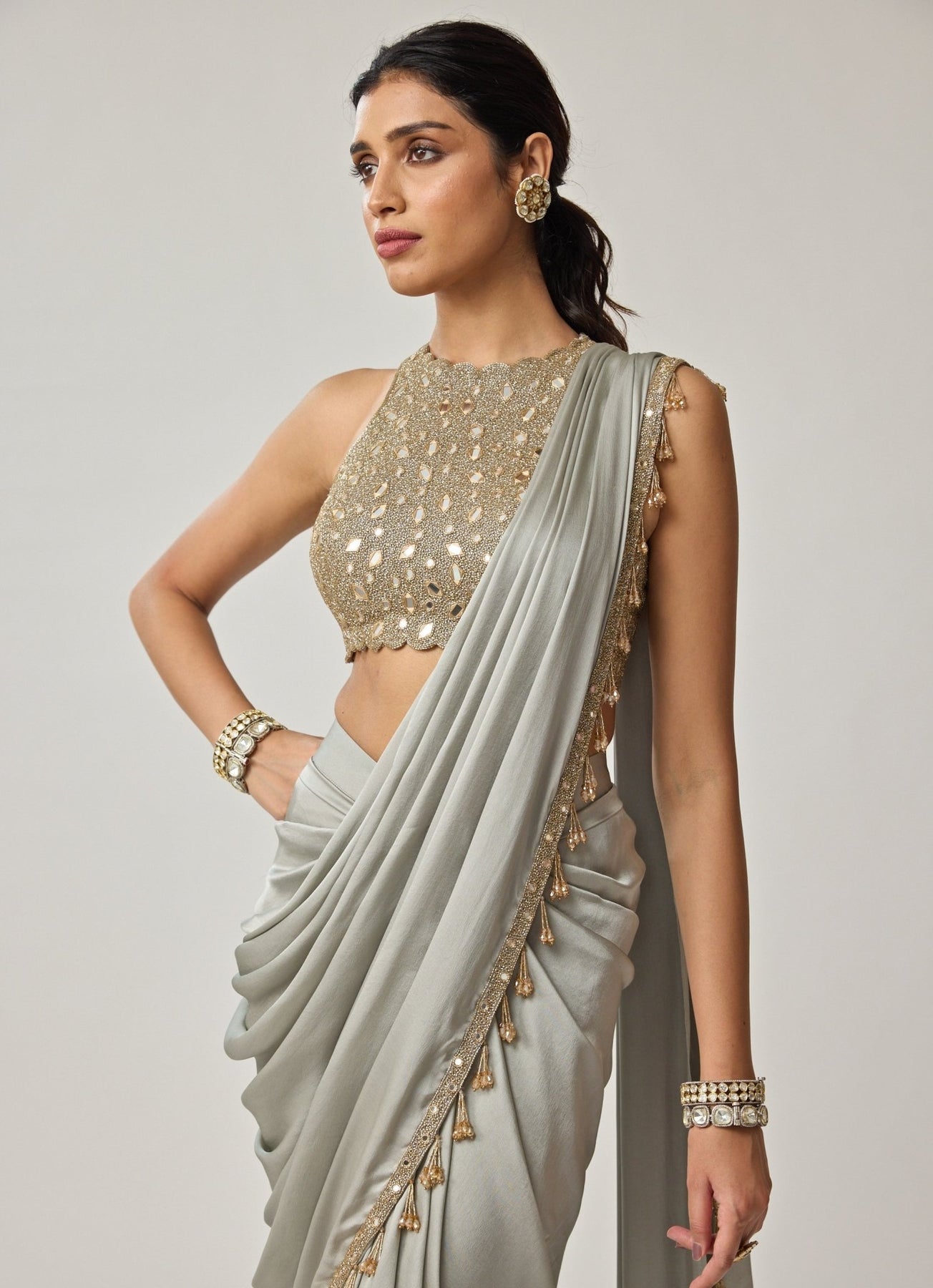 Bring playful glamour to every event in this Powder Grey Satin Pre-draped Saree. The ready to wear saree drapes flawlessly, complemented by a mirror-embroidered halter neck blouse that sparkles with artisanal detail.