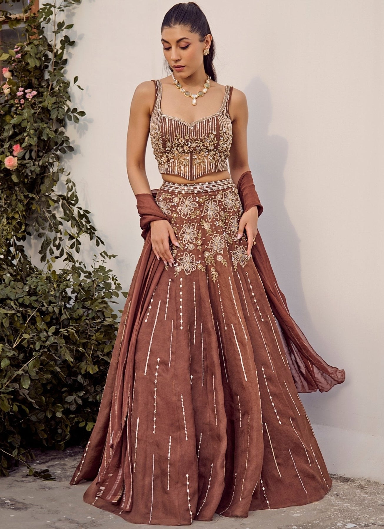 Radiate elegance in this stunning Brown Embroidered Corset Lehenga Set—a timeless fusion of tradition and modernity. Crafted from luxurious silk organza, the brown lehenga is beautifully adorned with intricate sequins, moti, and cutdana work, forming delicate floral motifs and scattered linear patterns that shimmer with every movement. Paired with a structured corset-style blouse, richly embellished to enhance the overall look. The look is completed with a sheer dupatta that adds a touch of ethereal charm.