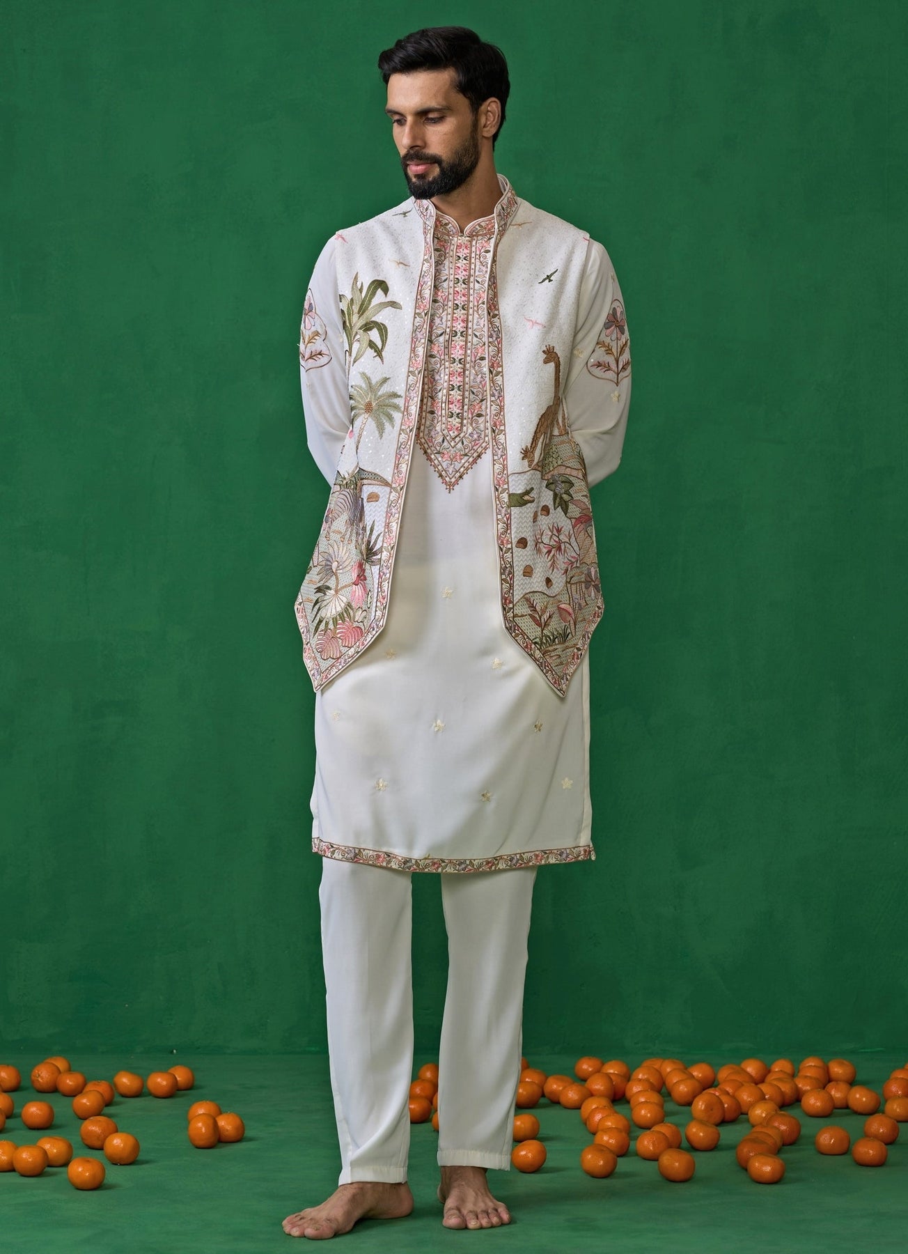 Radiate timeless grace in this ivory embroidered georgette kurta jacket set, a refined ensemble that combines traditional artistry with modern elegance. The look features a straight-cut ivory kurta paired with slim trousers, layered with a beautifully embroidered jacket. The jacket showcases intricate detailing along the neckline, front panels, sleeves, and hem, with motifs inspired by nature—featuring animals and trees that bring depth and character to the design.