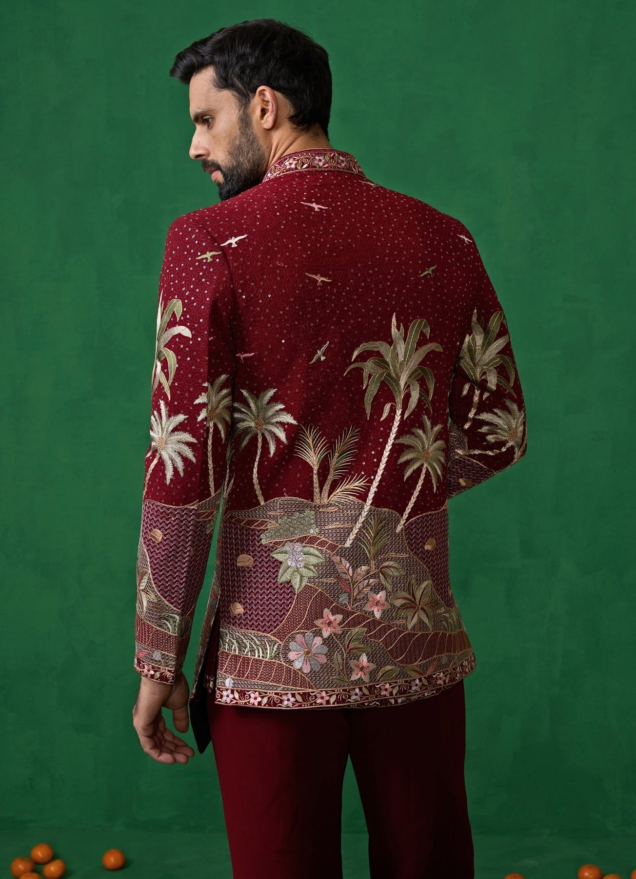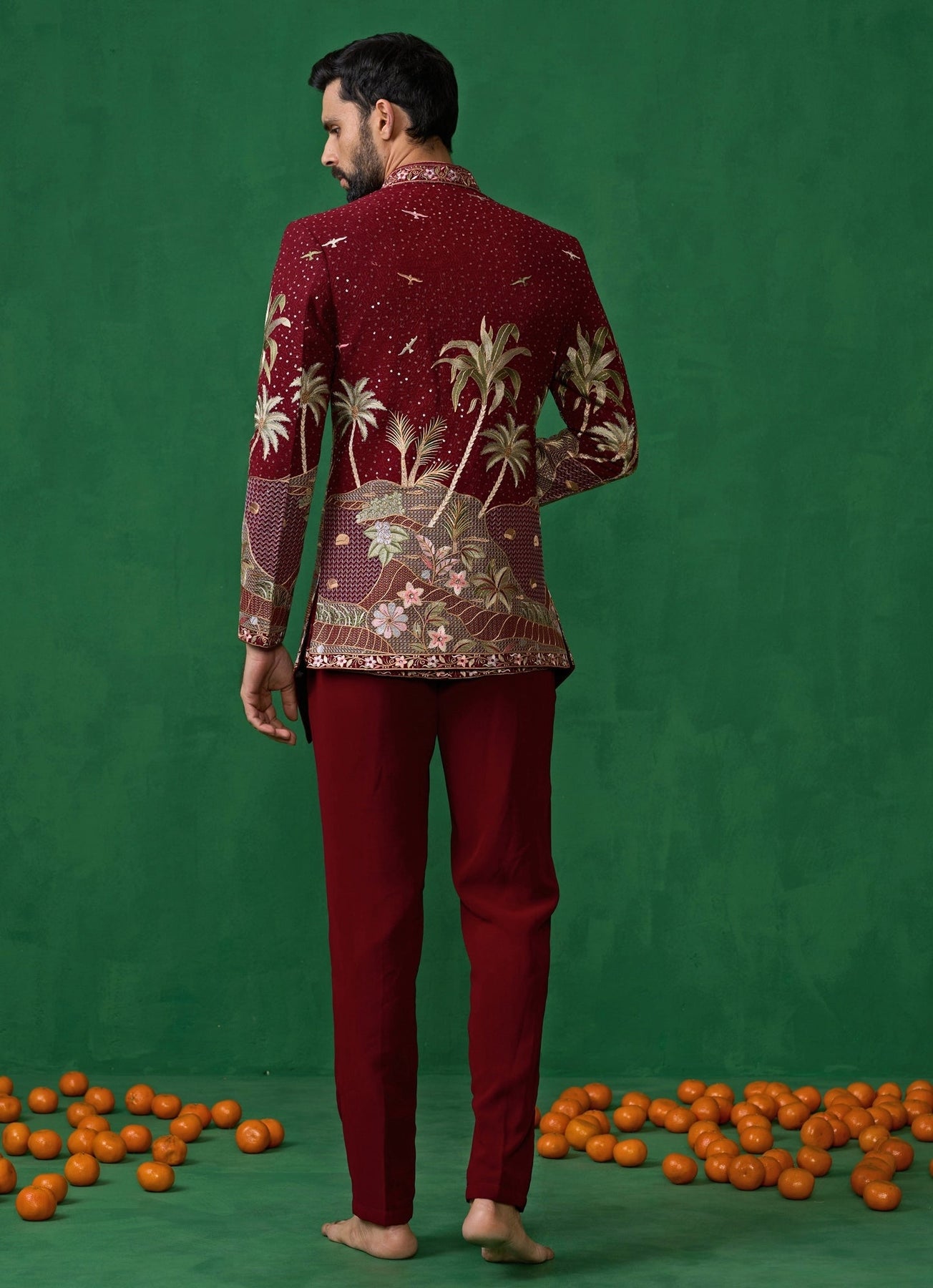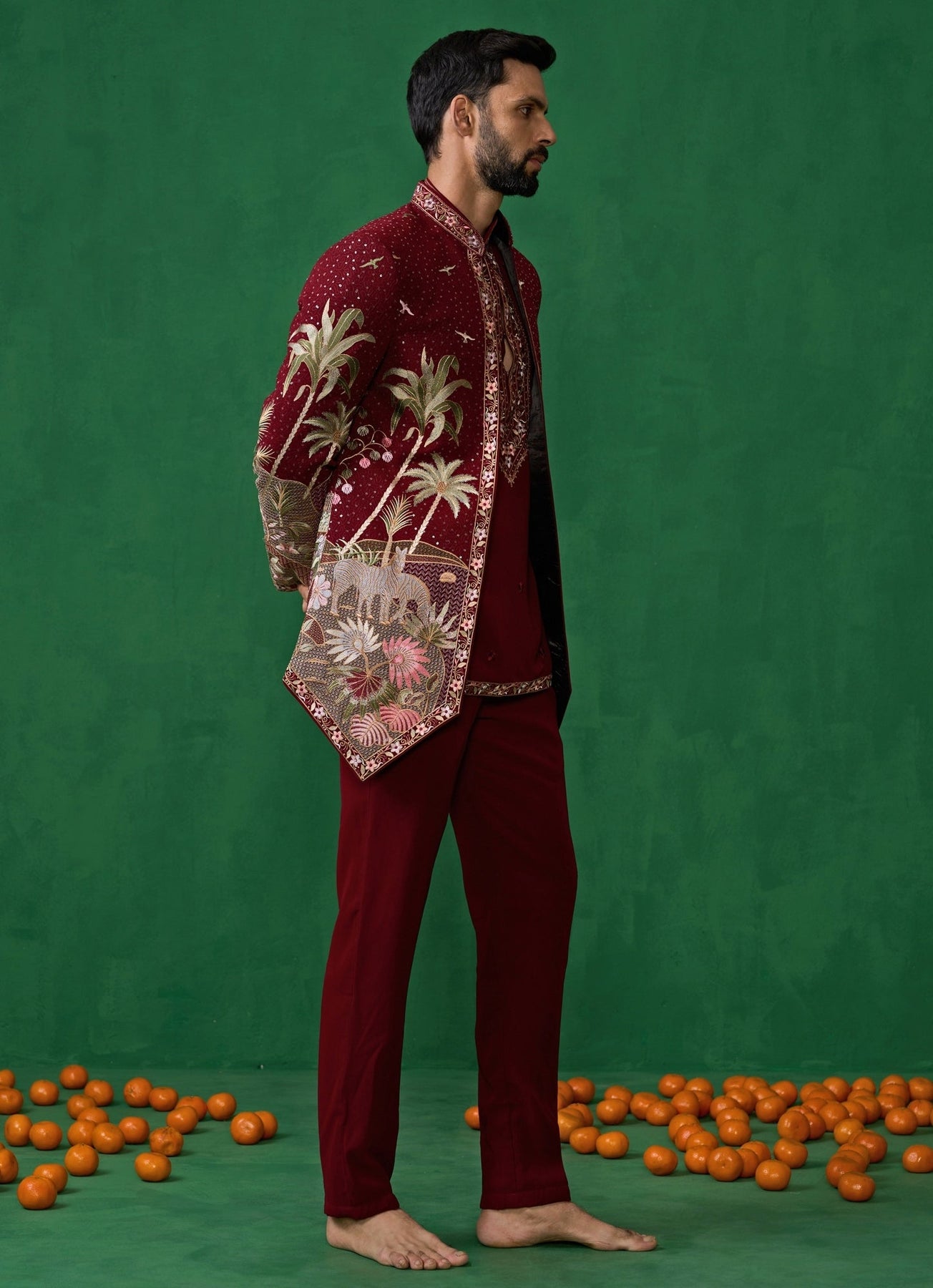 Command attention in this maroon red embroidered georgette Jodhpuri set, a refined ensemble that exudes regal sophistication. The look features a short straight kurta paired with slim trousers and layered with an exquisitely embroidered jacket. The jacket stands out with intricate detailing along the neckline, front panels, sleeves, and hem — adorned with nature-inspired motifs like animals and trees that bring artistic depth to the design. The understated kurta beneath allows the richly embroidered jacket to remain the focal point.