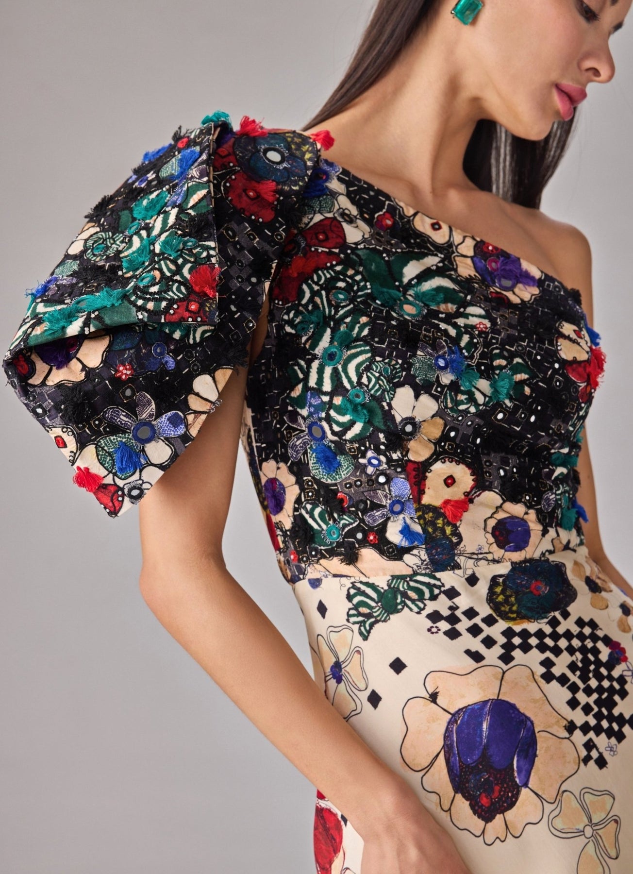 Celebrate dramatic elegance in this Multicolour Floral Print One Shoulder Gown designed for unforgettable wedding moments. The structured one‑shoulder design creates a bold architectural presence while floral and checkered placement prints bring vibrant energy. Intricate mirror, tassel and thread embroidery enrich the sleeve and bustier area with handcrafted detail.