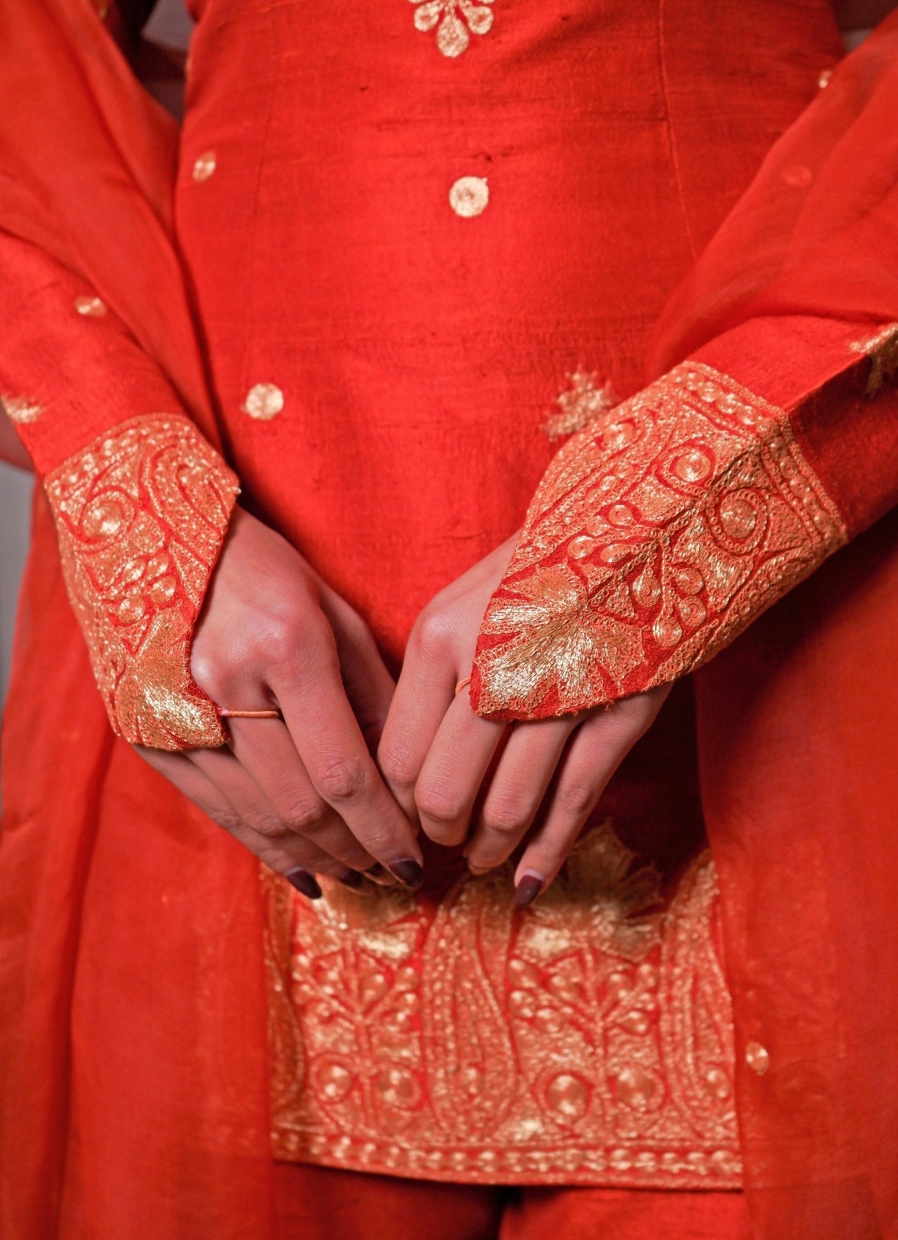Celebrate mehendi festivities in rich, heritage-inspired style with this Rust Orange Kurta Pants Set. The kurta is embellished with Kashmiri work that adds refined craftsmanship and intricate texture to the look. Farshi salwar pants keep it modern and easy to wear, while the organza dupatta adds a light, festive finish.