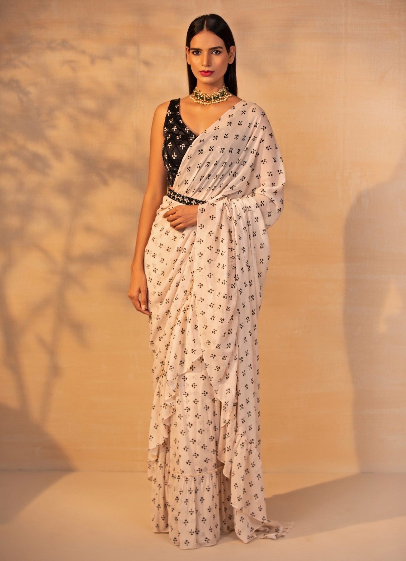 fabiliciousfashion@gmail.comMake every entrance unforgettable in this Ivory Printed Ruffle Saree with Black Blouse that combines softness with striking contrast. The saree flows with layered ruffles that bring texture and fluidity to the printed base, creating an effortlessly polished festive mood. It is paired with a black embellished blouse and matching belt that sharpen the look with modern glamour.