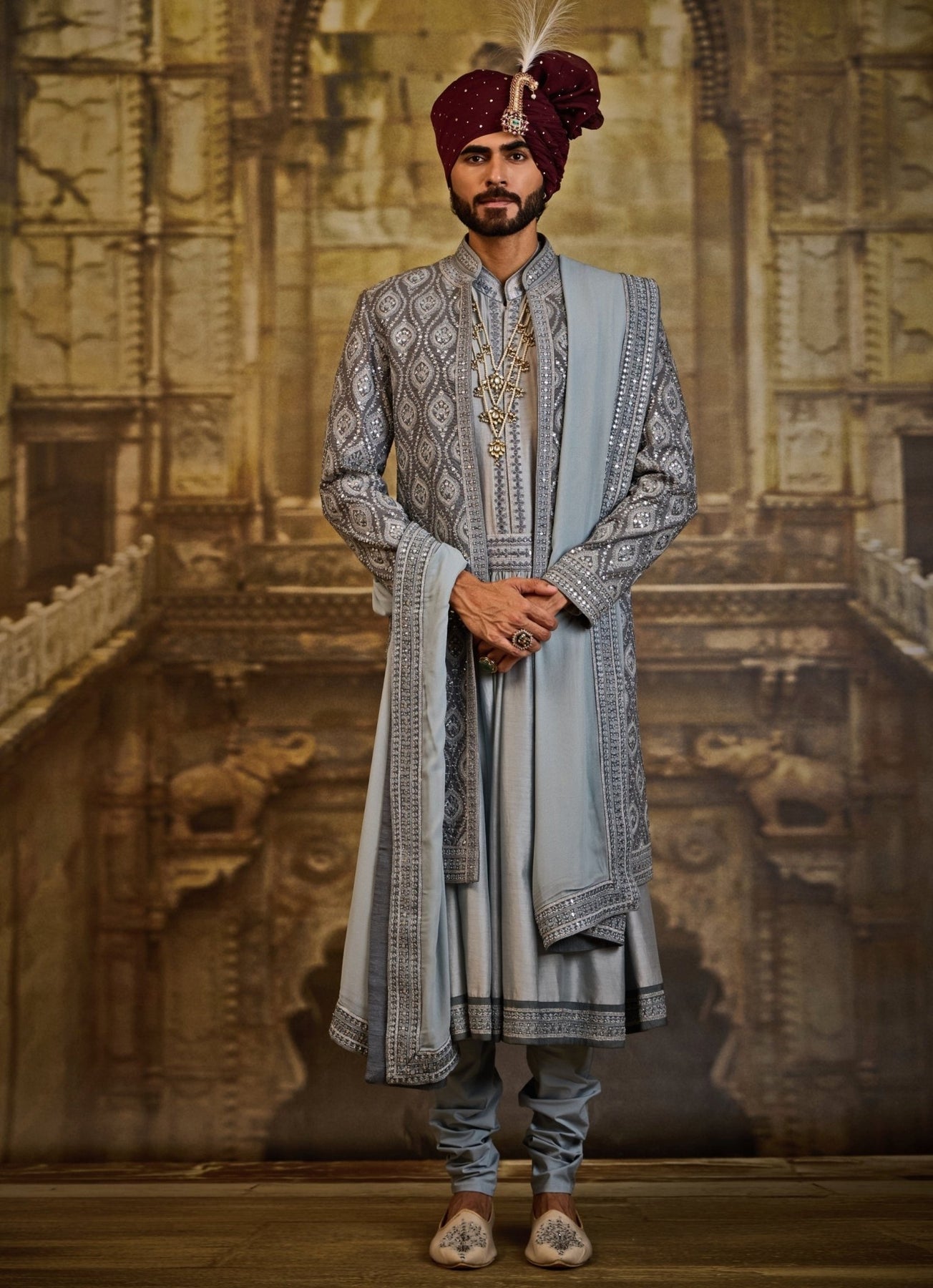 Command attention on your big day with this refined Bluish Grey Sherwani Set, crafted in rich tissue brocade. The open jacket sherwani is intricately worked in resham and patra detailing, layered over a coordinating choga and classic churidar for a regal finish. Optional accessories like a statement stole and worked jutis enhance its grandeur.