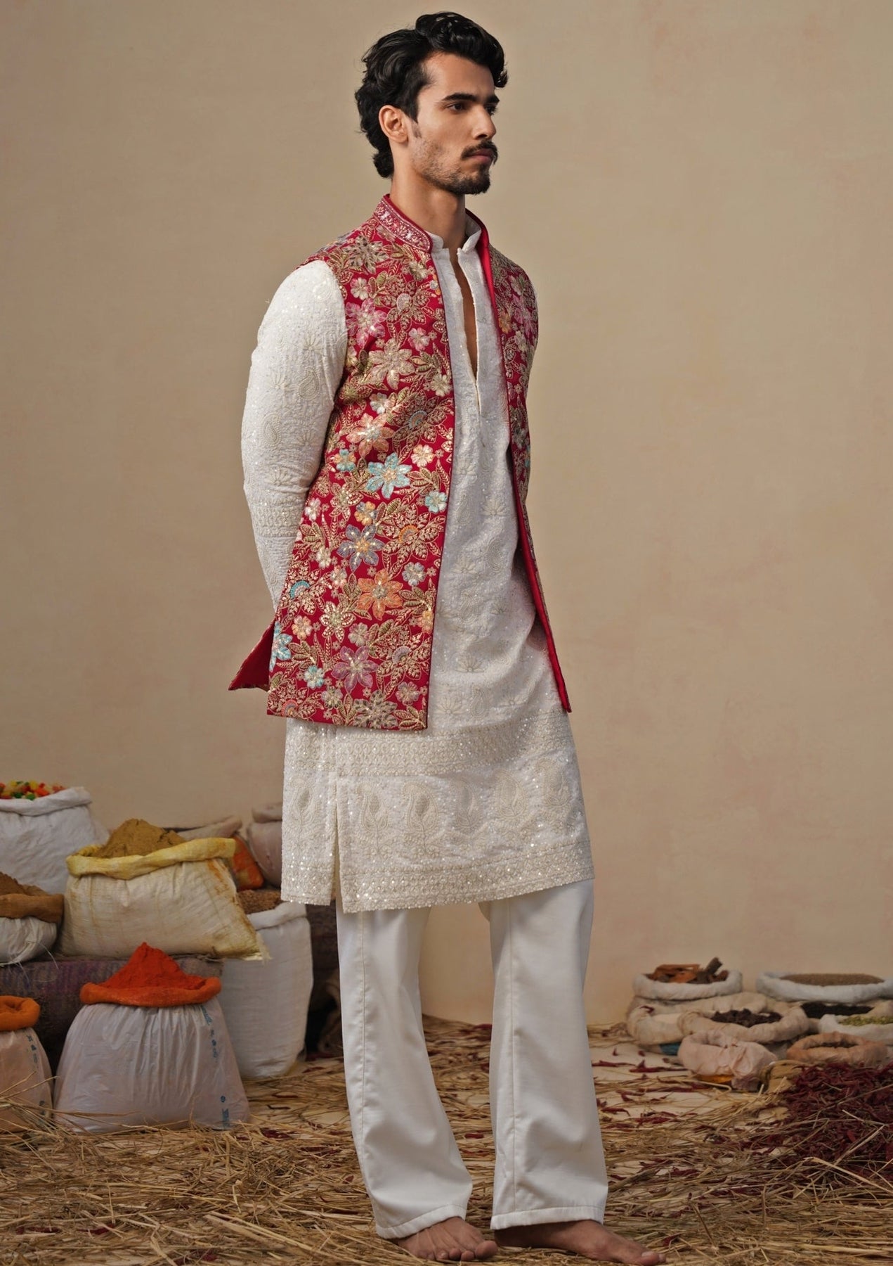 Bold colour meets refined craftsmanship in this Ivory and Hot Pink Kurta Jacket Set made for meaningful celebrations. The straight pants ensure a tailored finish that feels modern and effortless. A neatly structured georgette kurta adds quiet texture, while the sleeveless jacket brings vibrance through floral embroidery and handcrafted detailing. The contrast feels celebratory without overpowering, making it ideal for milestone moments.
