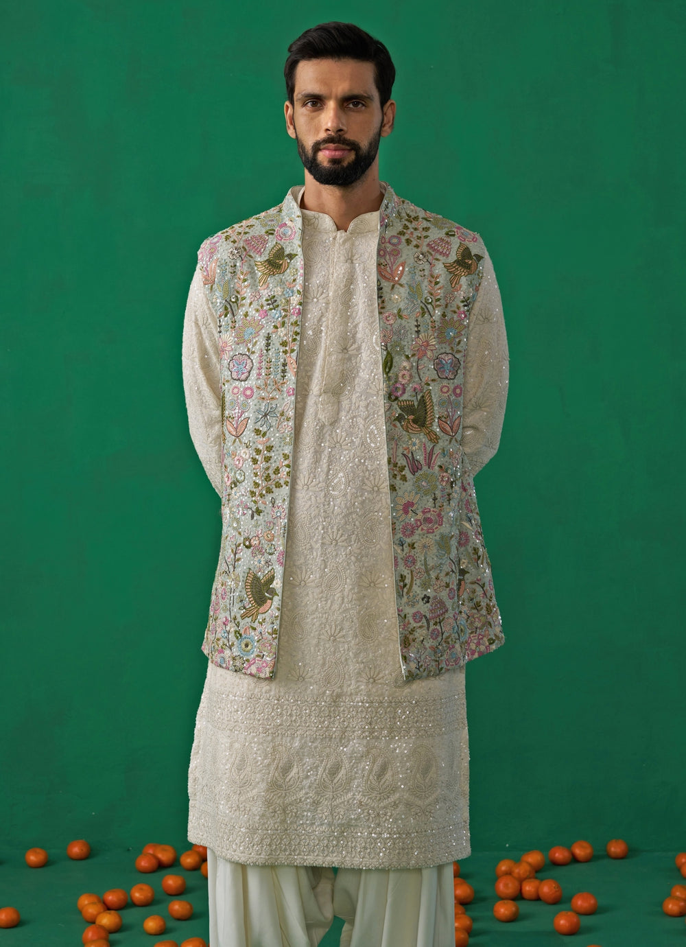 Sky Blue and Ivory Floral Embroidered Georgette Kurta Jacket Set