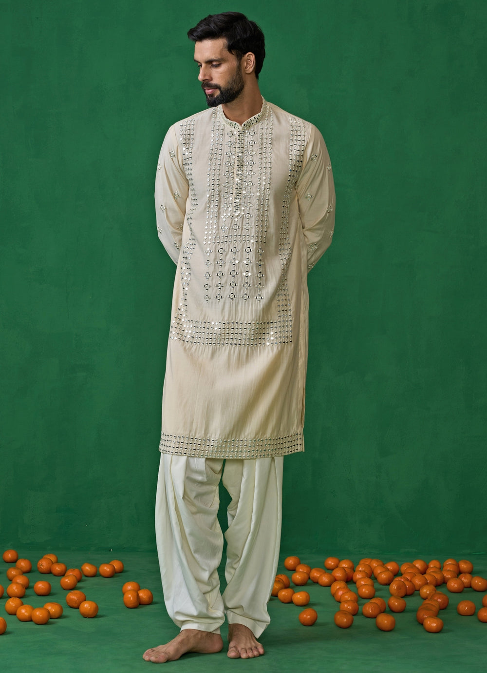 Beige and Green Mirror Embroidered Silk Kurta Set