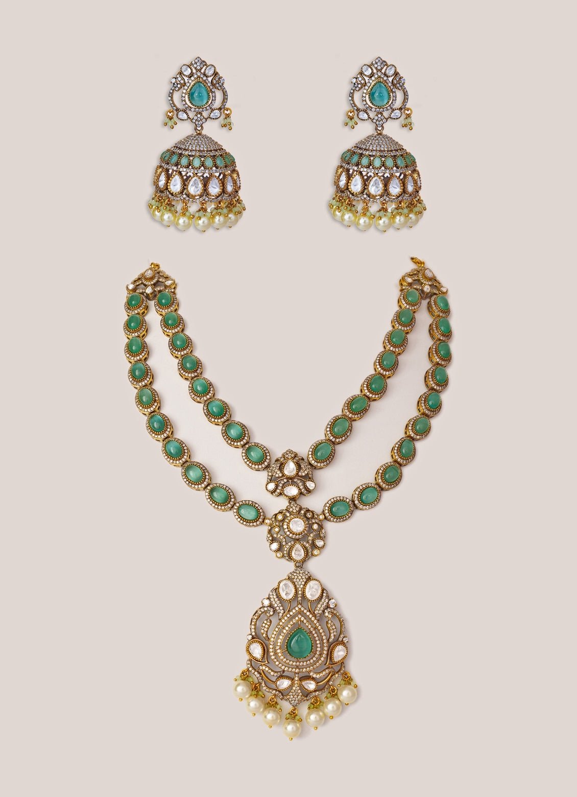 Green Stone And Polki Two Toned Long Necklace Set Zevar by Geeta - Fabilicious Fashion