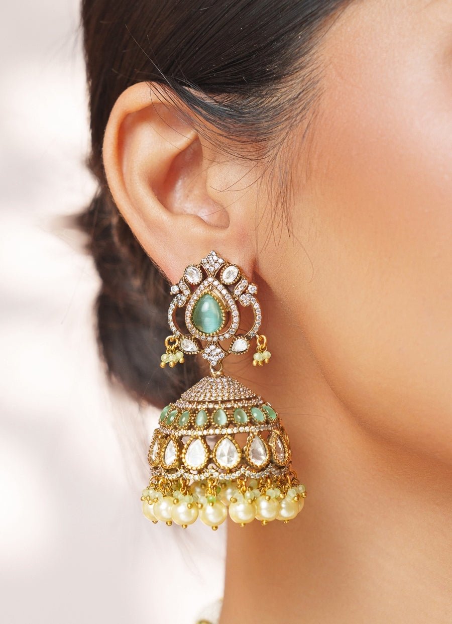 A regal choker adorned with green stones and uncut polkis in two-tone brilliance. The delicate finish and matching earrings evoke timeless heritage elegance, making it a refined accessory for a lehenga.