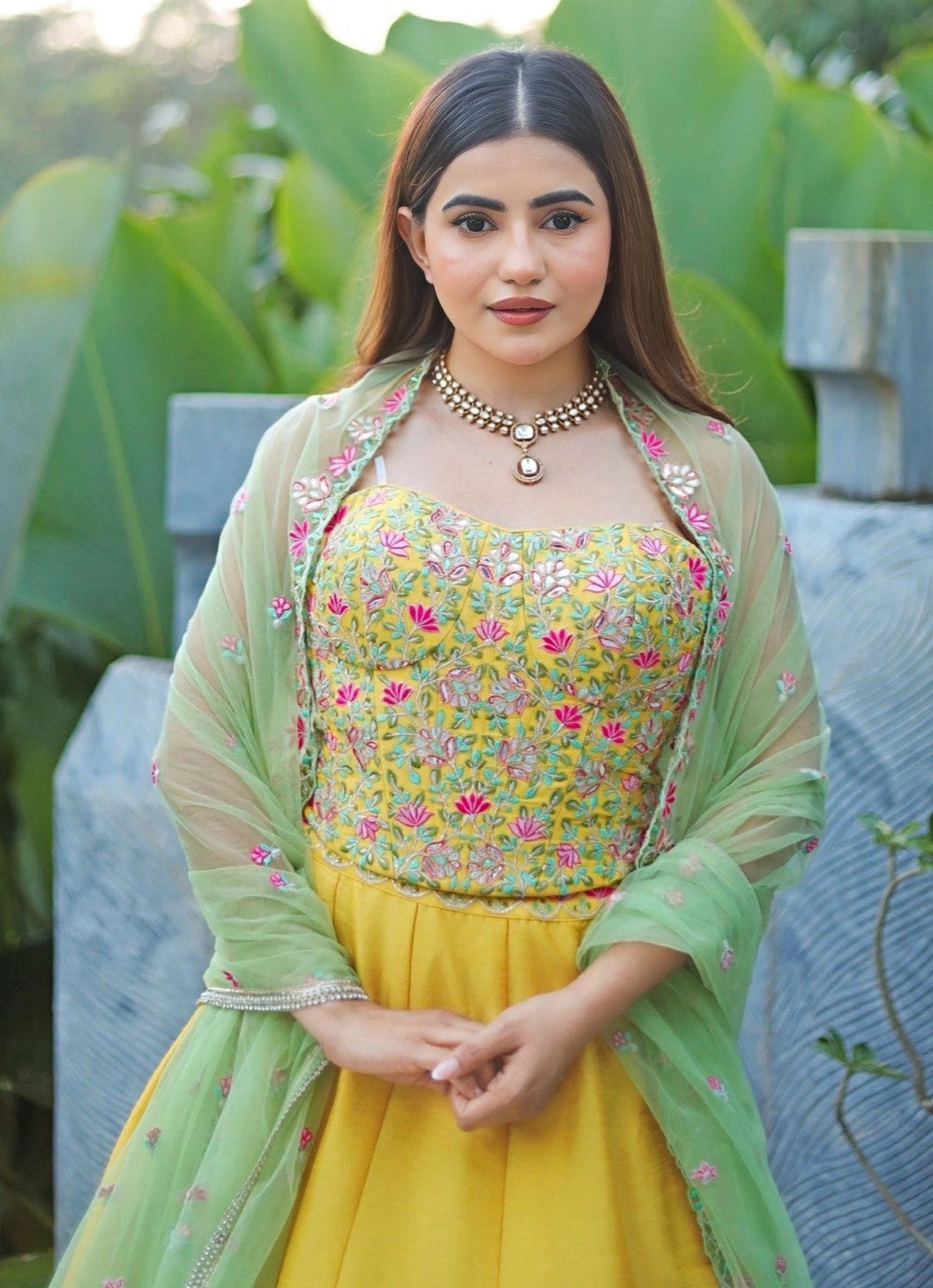 Brighten every celebration with this Yellow and Green Silk Embroidered Lehenga Set. Crafted in silk, the lehenga and corset blouse feature tulip motifs in colourful resham and faux metallic leather embroidery, paired with a contrasting green embellished tulle dupatta for a striking finish.