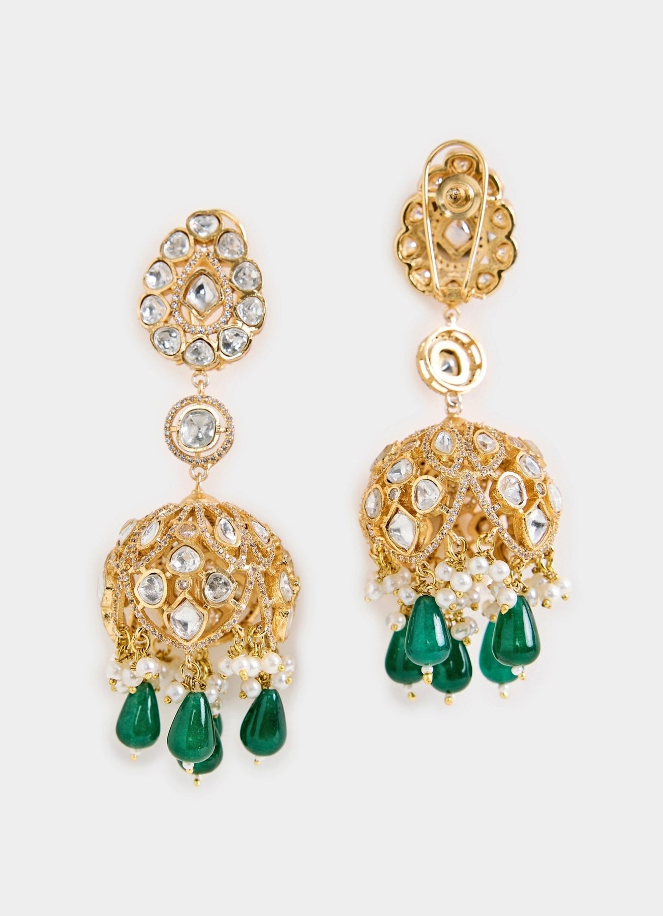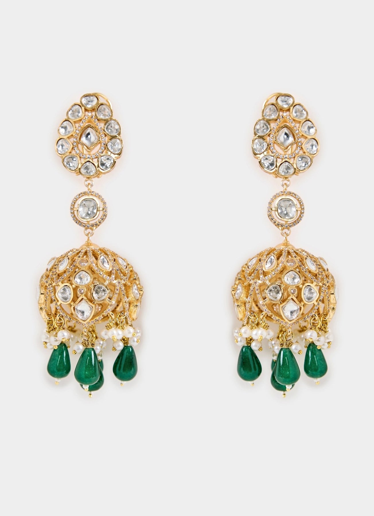 Elevate your festive and wedding look with these emerald green drop statement earrings, featuring intricate gold-toned detailing and sparkling stones. Designed to bring vibrant elegance to parties, occasions, and gifting moments.