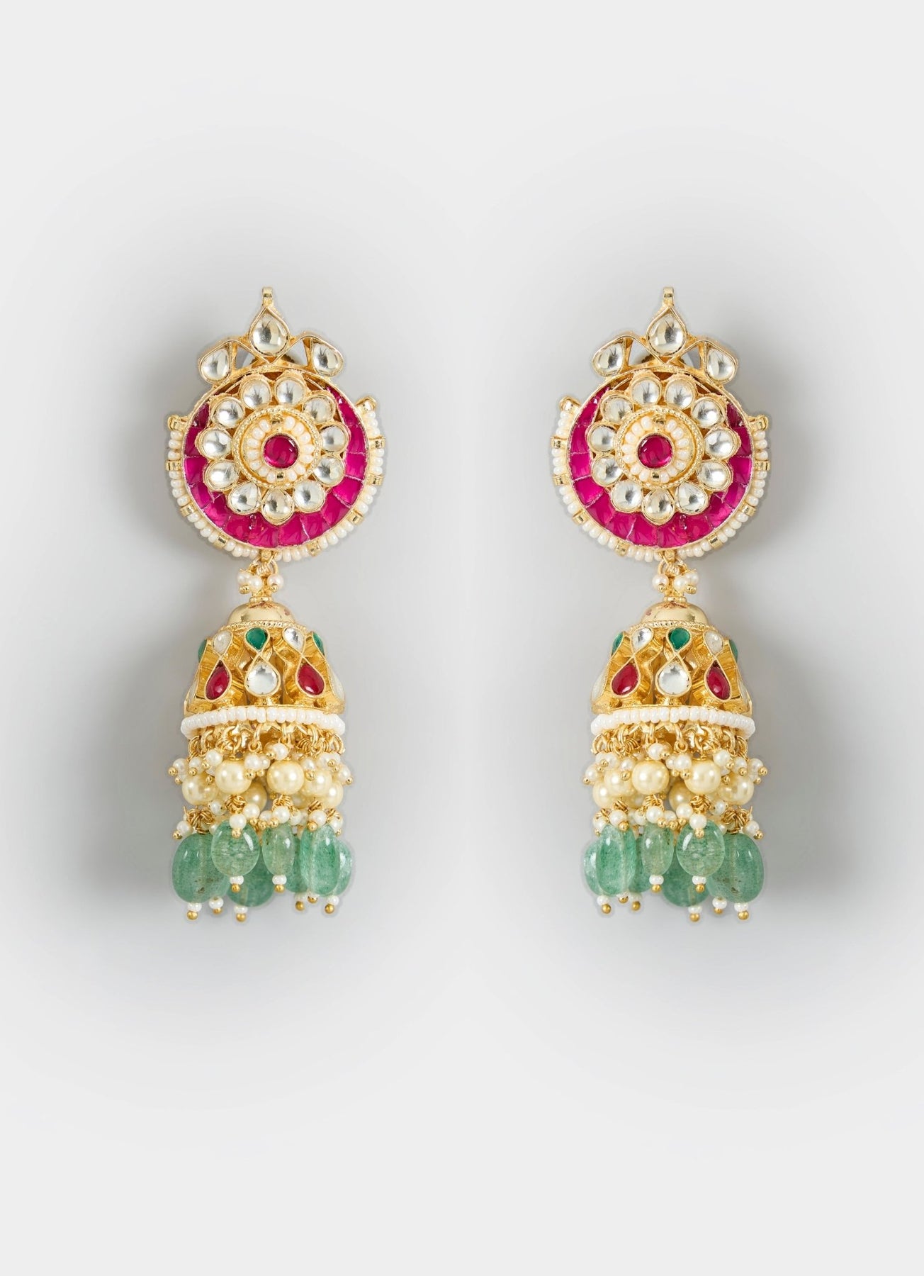 Featuring gold-finish jhumka earrings studded with pink stones, this pair blends traditional artistry with delicate mixed-metal charm. Designed to enhance festive occasions and wedding ceremonies, they bring elegance and a soft glow to your look.
