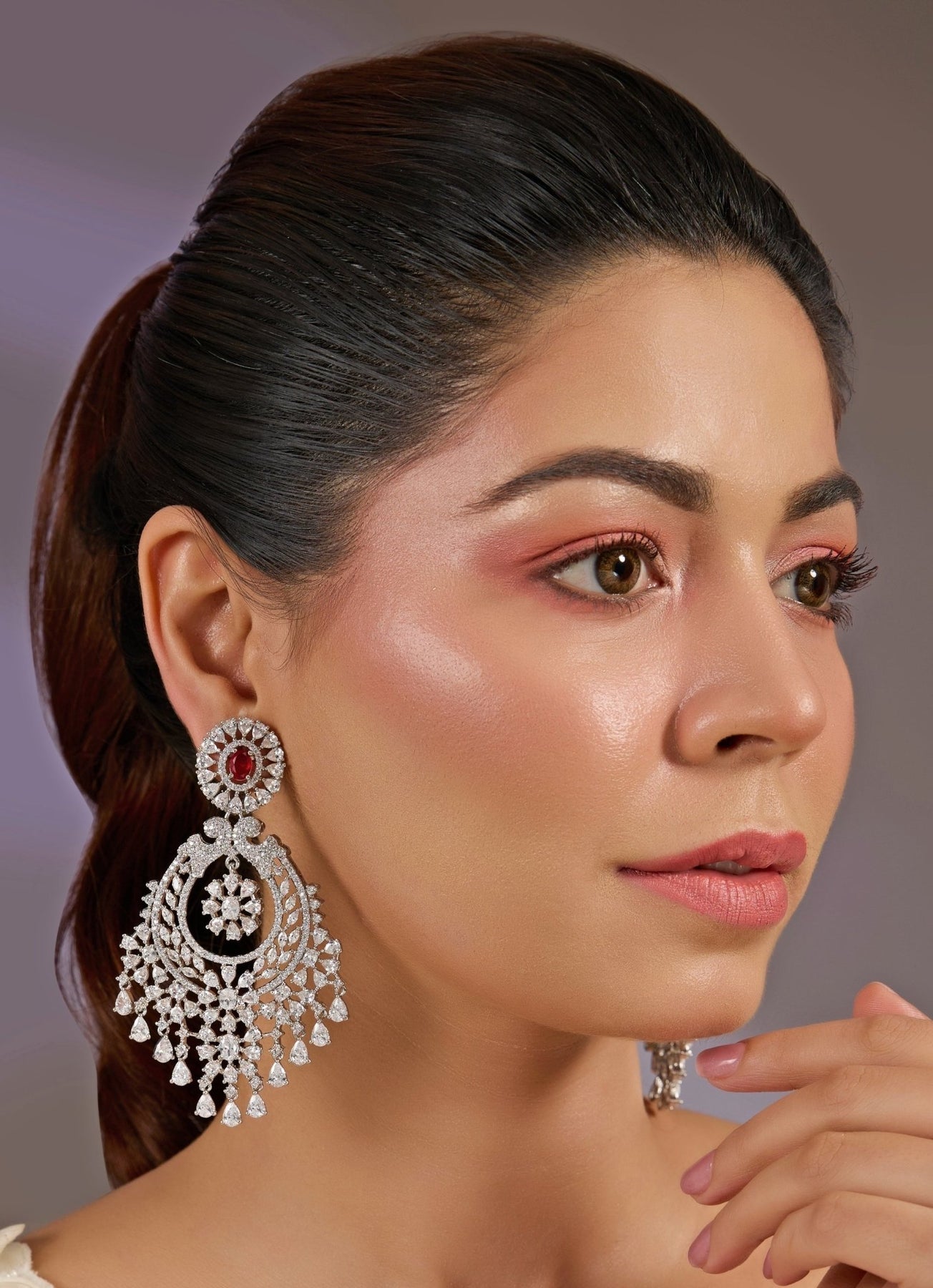 A stunning chandelier earring featuring a bold red onyx stone centerpiece framed by sparkling cubic zircons. Lightweight yet striking, its a gorgeous pick for weddings, festive celebrations, and elegant evening looks.