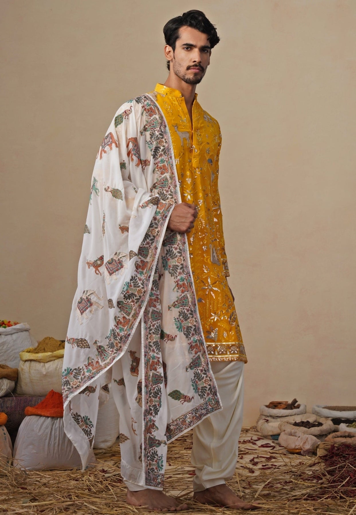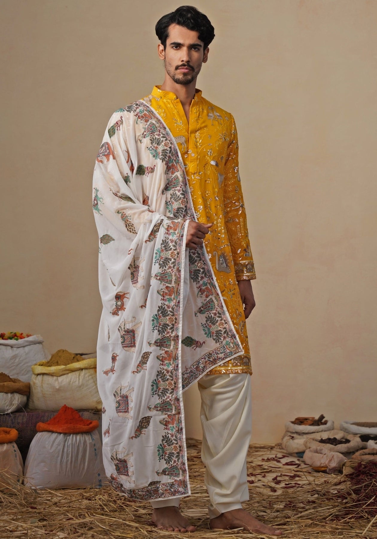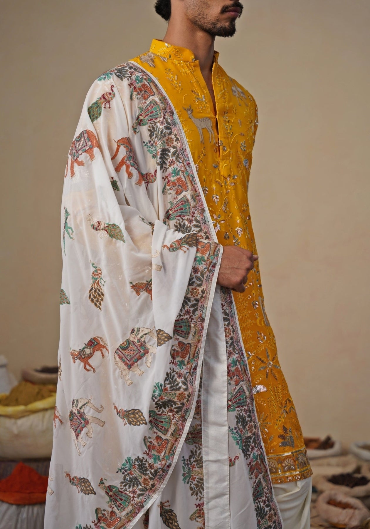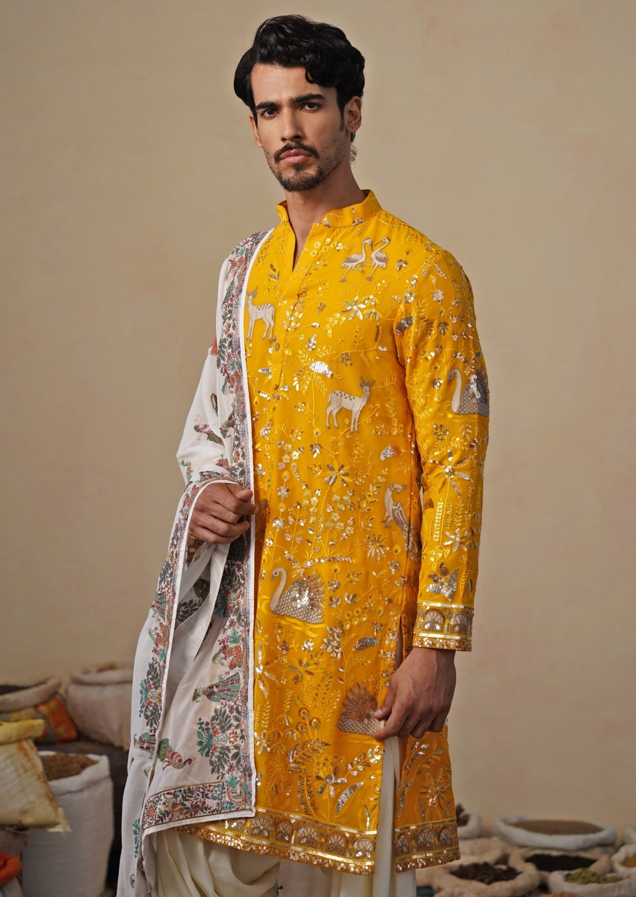 Bright, celebratory, and impeccably detailed—this Yellow and Ivory Kurta Set brings sunshine to special occasions. The Patiala pants sit comfortably and keep the look traditional yet effortless. Crafted in georgette, the long kurta is embroidered with peacock, swan, and deer motifs in an all-over arrangement that feels ornate but refined. Finish with the contrasting patterned stole for a polished, photo-ready touch.