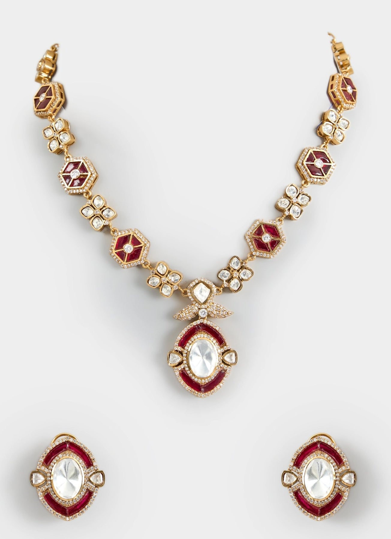 An elegant gold-toned necklace set featuring oval polki stones, pink accents, and matching earrings. Designed for weddings, festive occasions, and timeless statement dressing, it brings refined charm to every celebration.