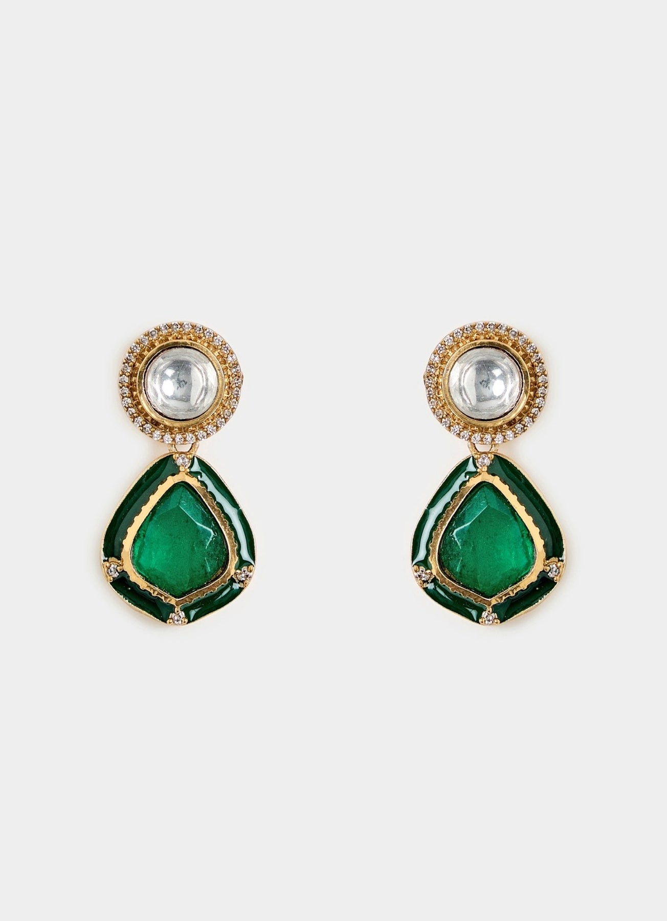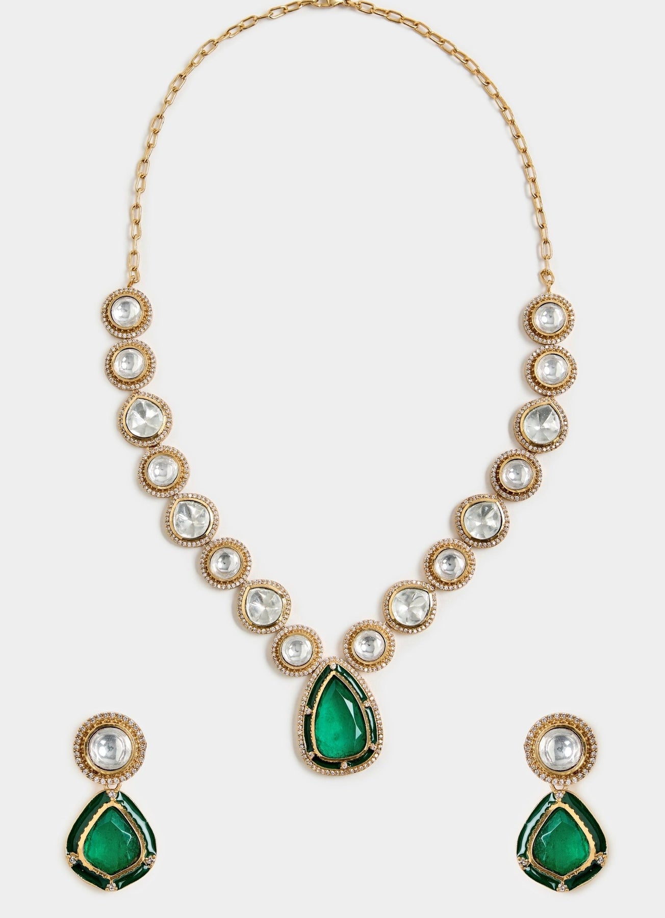 A refined Moissanite Kundan Polki necklace set featuring a classic design with a green teardrop pendant and matching earrings. Timeless and graceful, it enhances bridal and festive ensembles with ease.