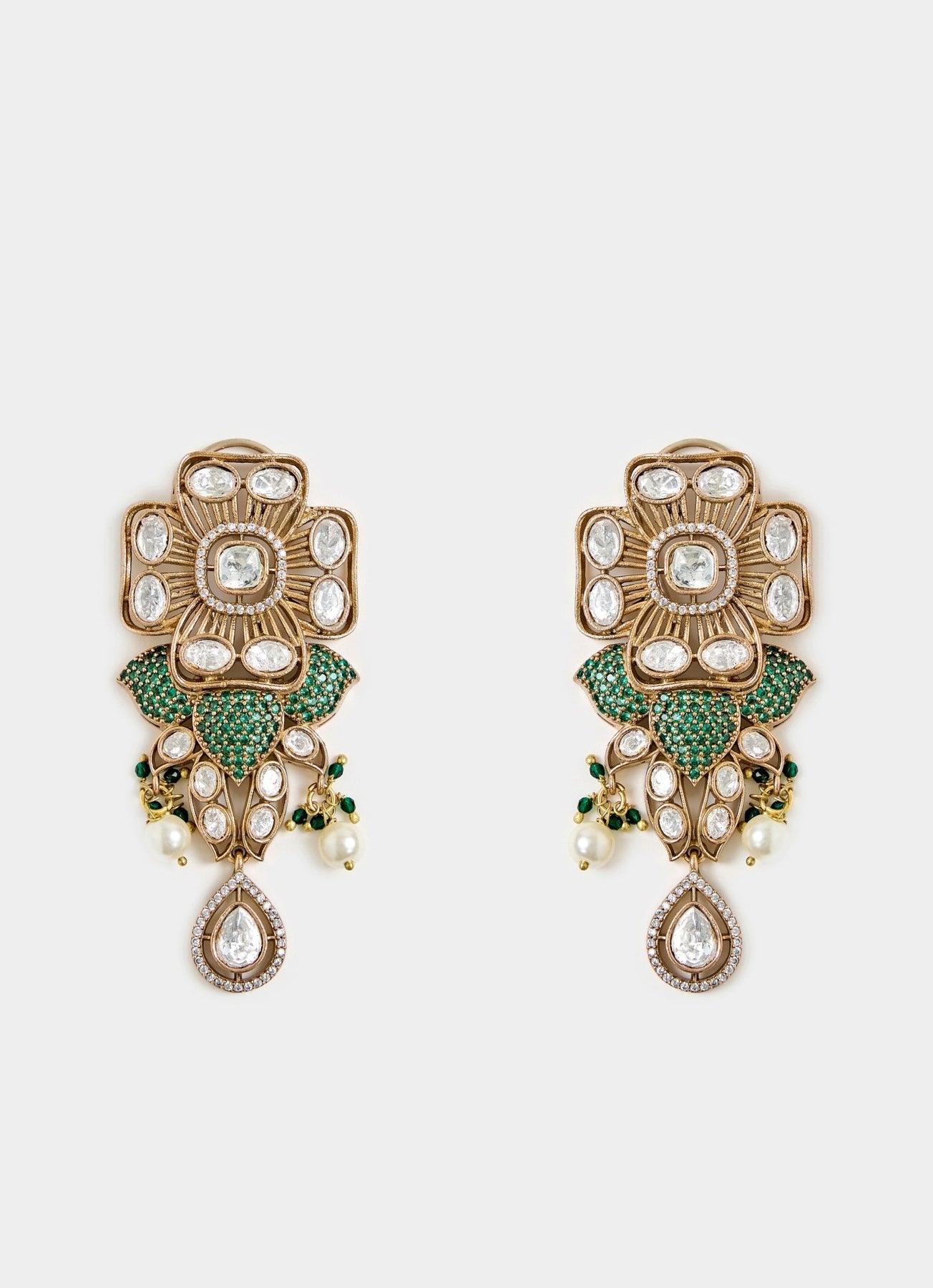 A stunning kundan and emerald statement necklace set featuring intricate floral motifs, pearl drops, and matching earrings. Regal and captivating, its a stylish pick for weddings, festive occasions, and traditional ensembles.