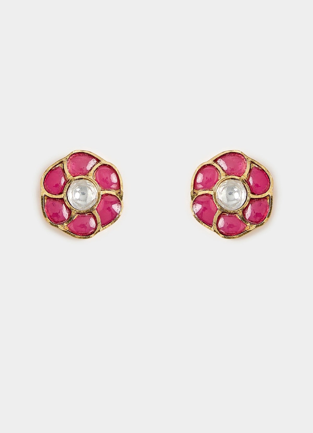 A ruby stone choker necklace set embellished with dazzling pink stones and intricate gold detailing, paired with matching earrings. Blending tradition with elegance, its a radiant choice for festive and wedding occasions.