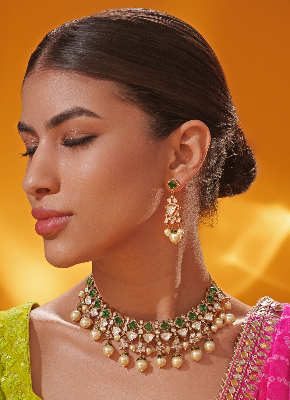 Green Polki 4 Layered Two Tone Long Necklace Set