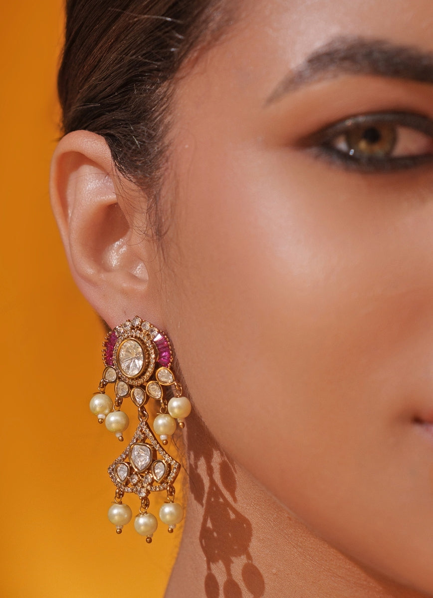 Red Moissanite Stone 3 Line Gold Long Necklace Set