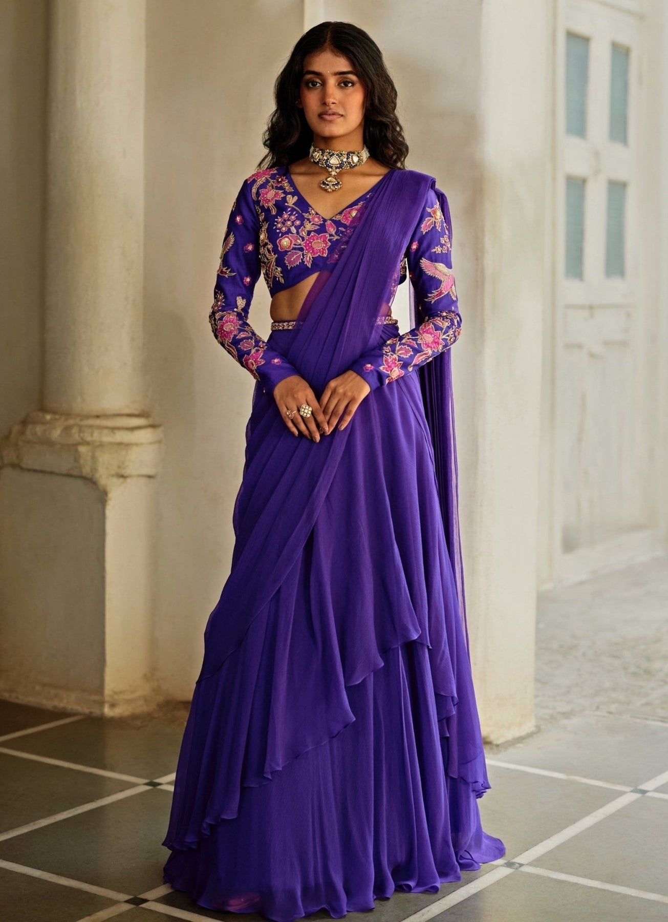 Own your cocktail moment in this solid Purple Pre-draped Saree, designed for modern glamour with zero fuss. The saree keeps the look clean and fluid, letting the floral power-shoulder blouse take centre stage with full hand embroidery and a light-catching shimmer. Easy to slip into and effortless to wear, it transitions from arrivals to dance floor with ease. Finish with strappy heels and a bold lip.