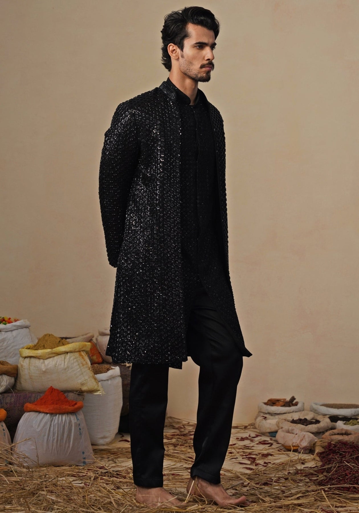 Own the night in this Black Indo-western Kurta Jacket Set, made for a groom-to-be who prefers quiet power over excess. Sleek straight pants set a sharp foundation, followed by a front-open kurta with refined surface texture for a clean, modern finish. The long jacket steals focus with linear cutdana embroidery that adds depth and a soft, light-catching sheen. Minimal closures and a clean neckline keep it polished.