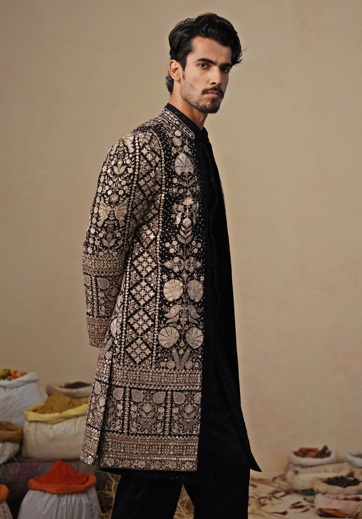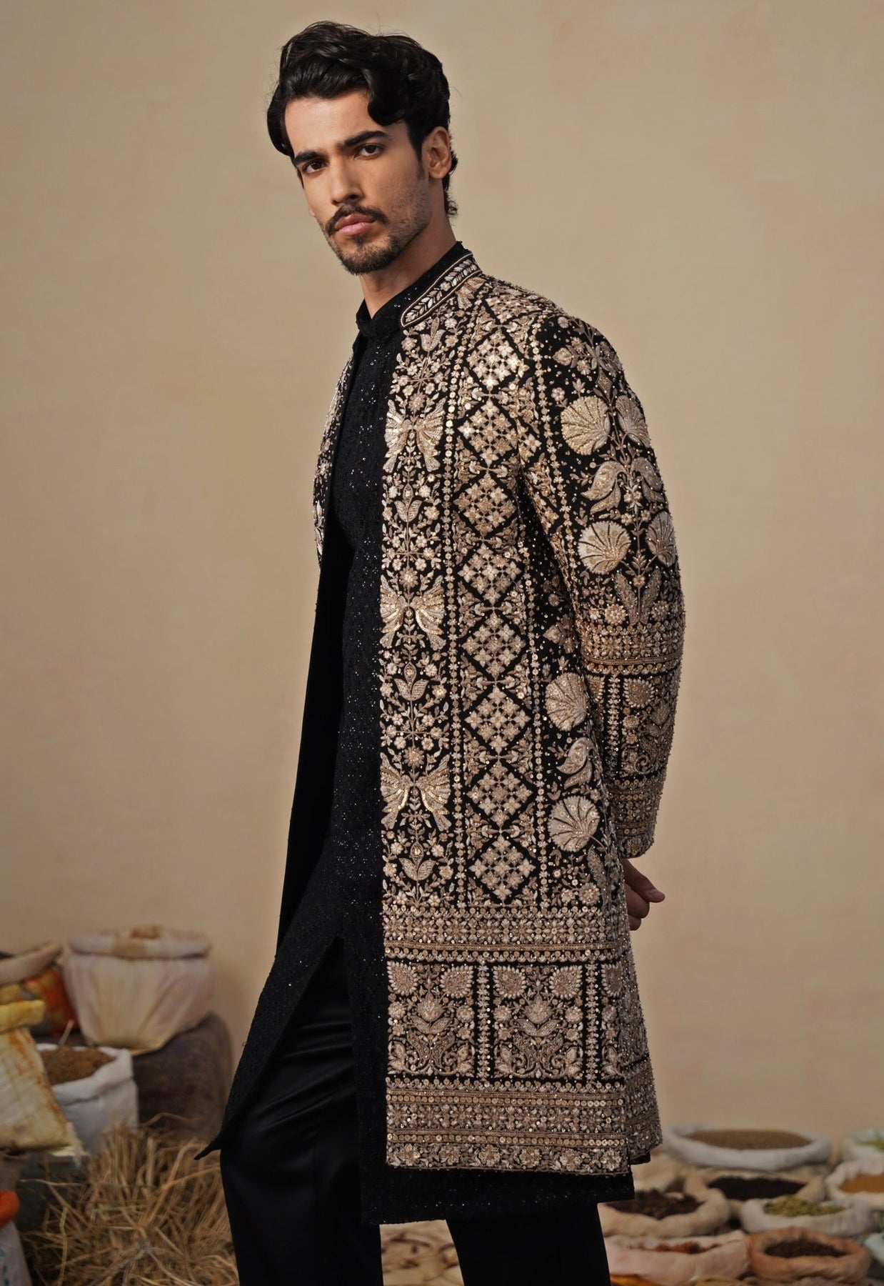 Set the tone for a polished celebration in this Black Indowestern Long Jacket Set with a sharp finish. Tailored straight pants keep the profile sleek, paired with an inner kurta featuring understated linear detailing for balance. The front-open jacket is richly embellished with cutdana in geometric and ornamental patterns, delivering texture and refined shine with every step. Clean neckline lines maintain a modern, composed feel.