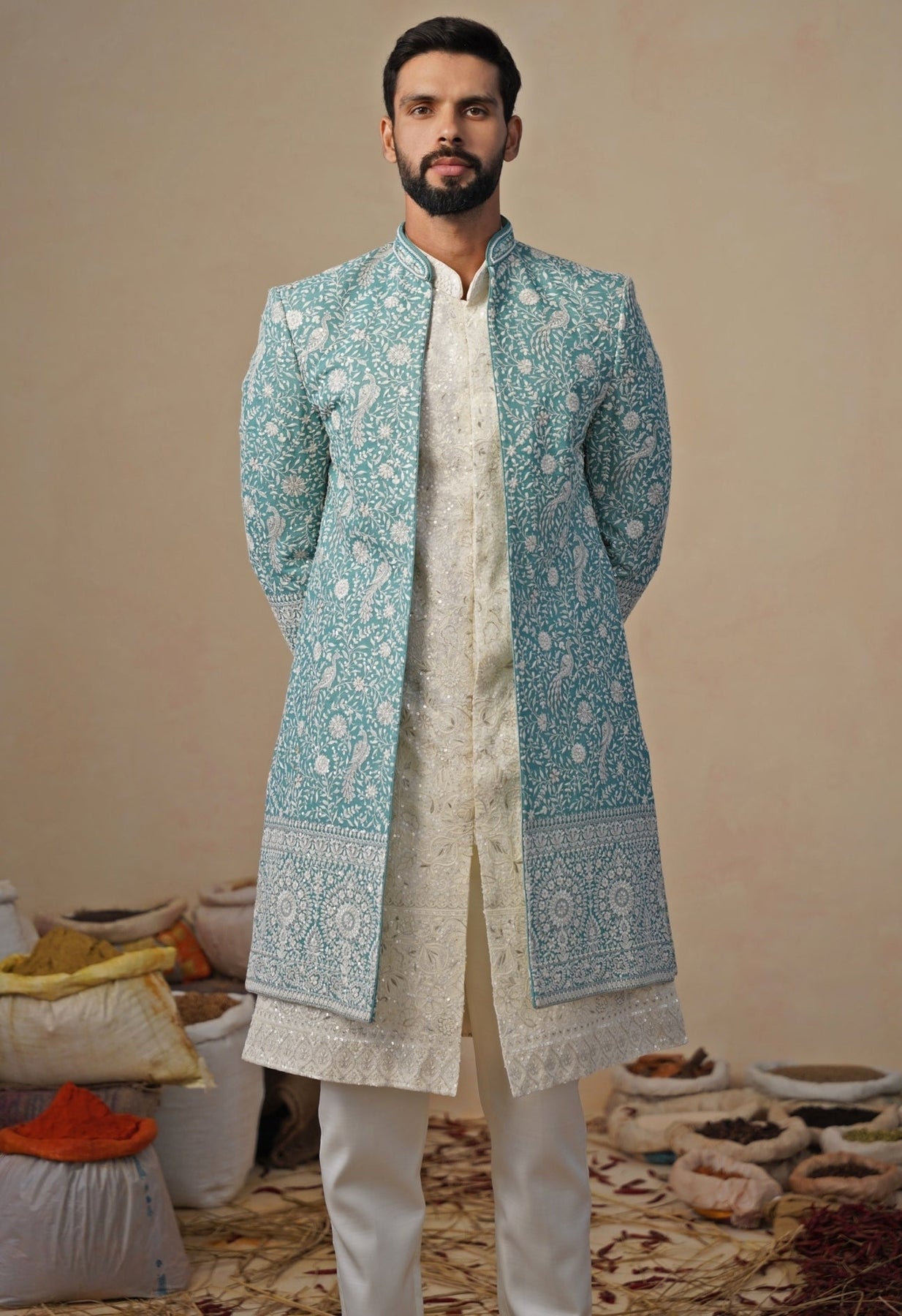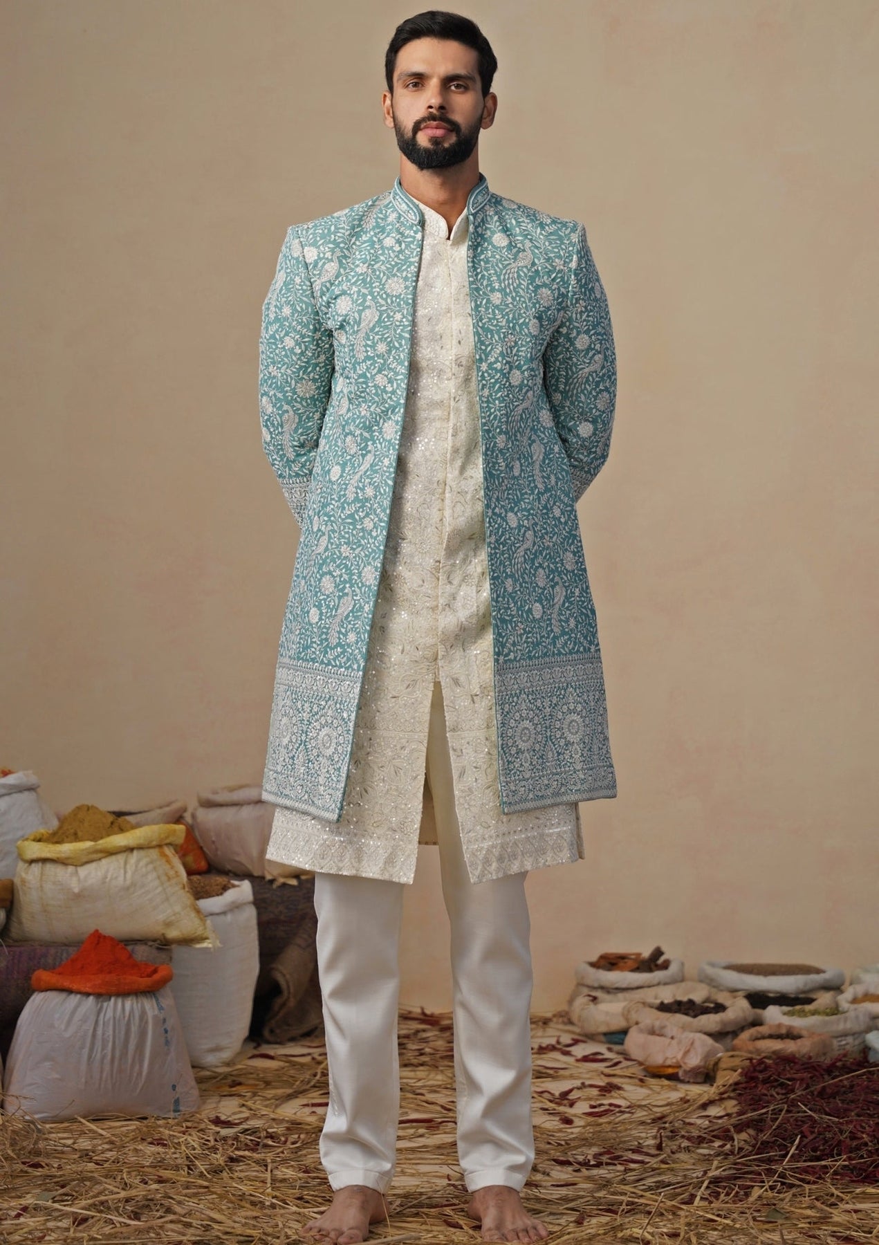 Choose modern ceremony with this Ivory and Blue Indo-western Kurta Jacket Set designed to shine at sangeet nights. Straight pants keep the finish crisp, layered with a coordinated inner kurta for clean lines. The long jacket features all-over floral and ornamental embroidery, adding depth, texture, and artisanal charm without overwhelming the look. The cool-toned palette feels regal, fresh, and effortlessly photo-ready.