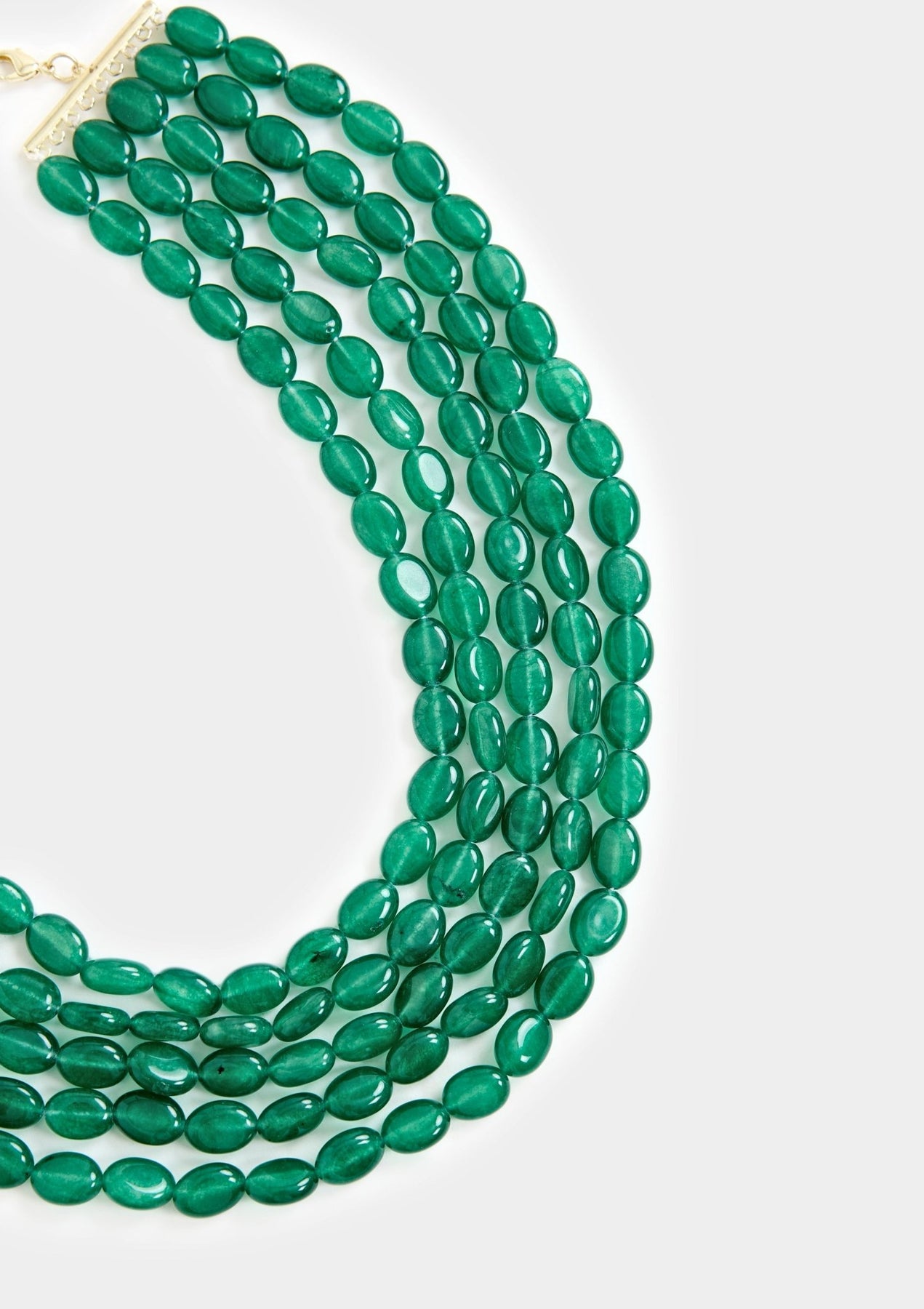 An elegant multi-layered green bead necklace handcrafted for a bold yet timeless look. Lightweight and versatile, it pairs beautifully with sarees, lehengas, and festive ensembles, adding richness and depth.