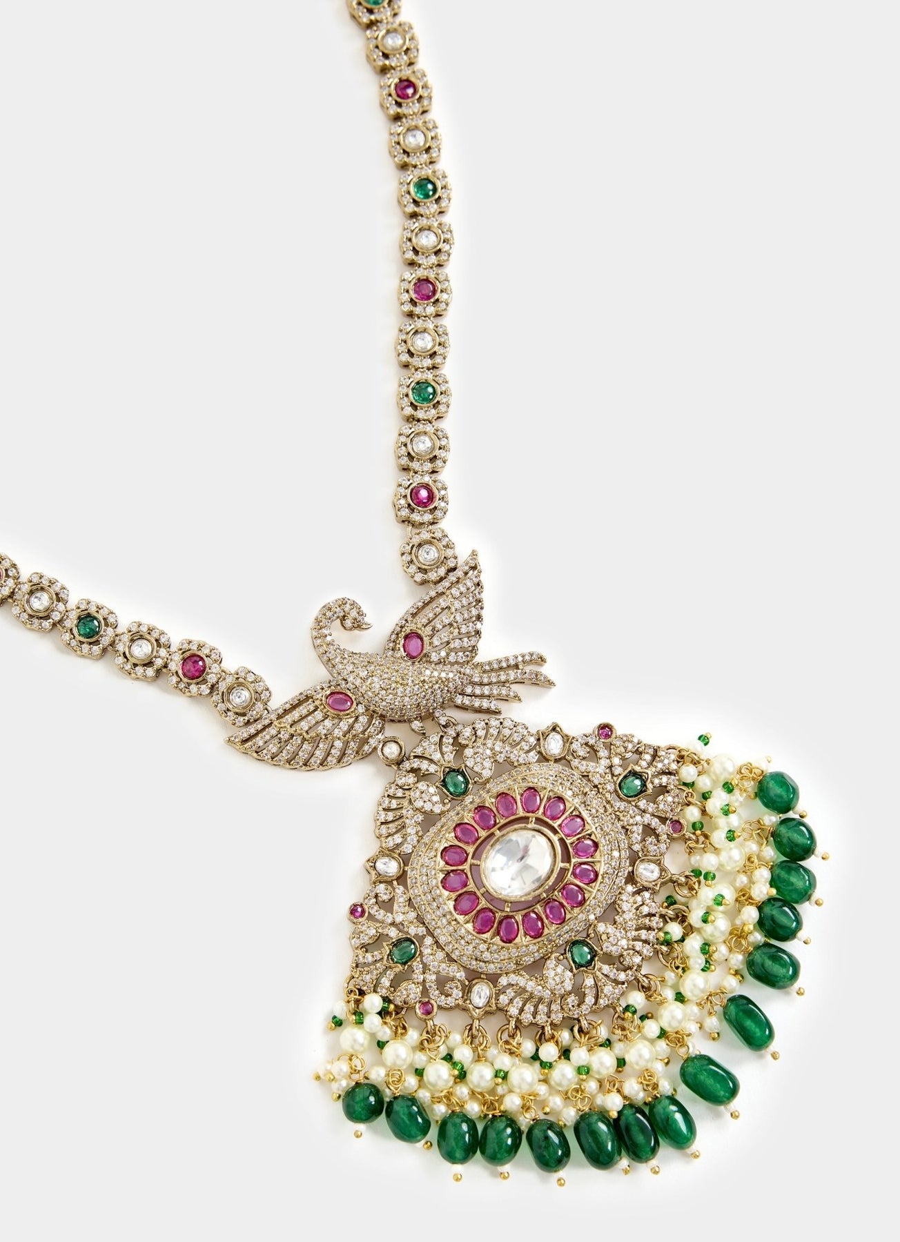 A traditional gold-plated long necklace set adorned with green and white stones, complete with matching earrings and a maang tikka. Beautiful pick for weddings, parties, and festive celebrations, it adds timeless elegance and cultural richness.